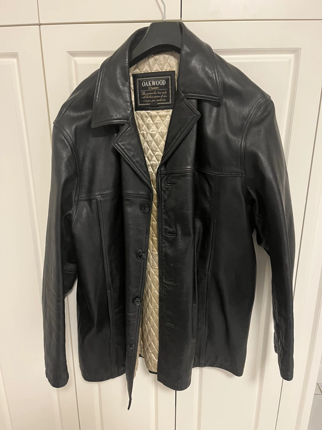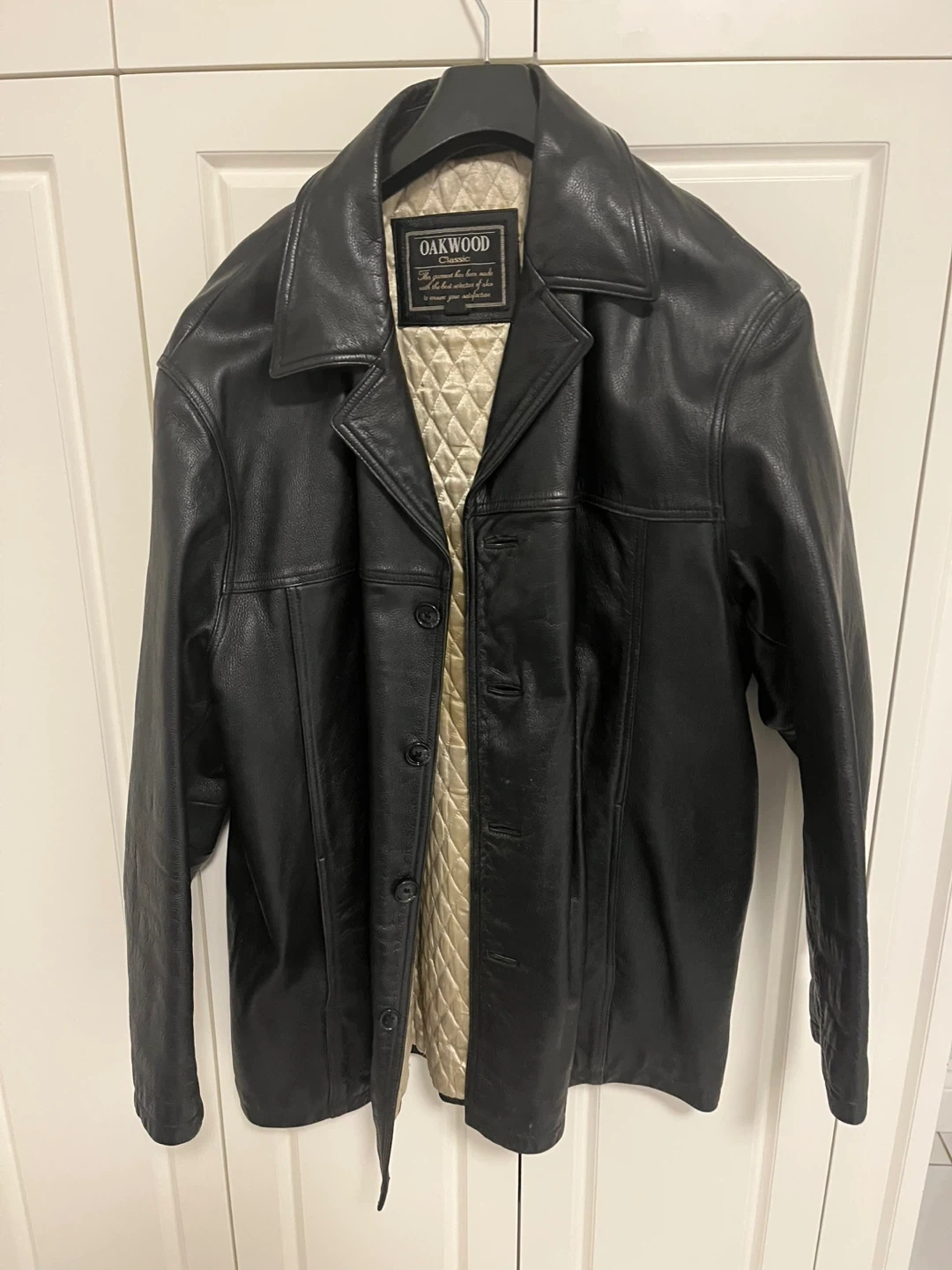 This is a gently worn Oakwood leather jacket, perfect for adding a touch of classic style to your wardrobe. This jacket features a button-up front, a smooth lining, and is made from high-quality leather, ensuring both comfort and durability. It is in good condition. Here are some features of the jacket: * Brand: Oakwood * Outer Material: Leather * Lining: Smooth fabric * Closure: Buttons * Style: Classic.