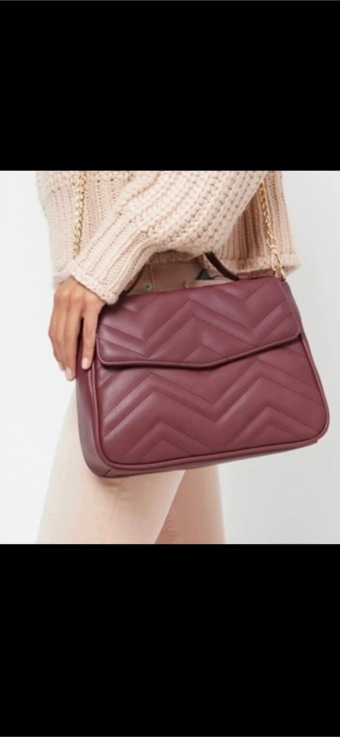 Burgundy crossbody bag with a gold chain strap and top handle. Has a flap closure with a magnetic snap.