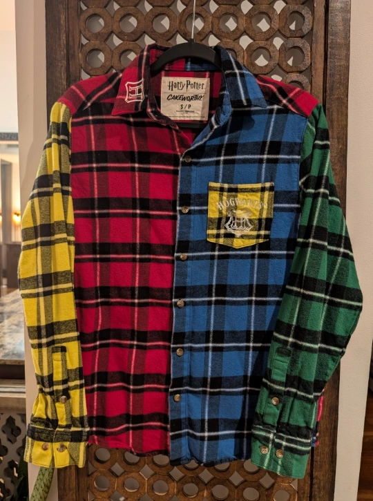 Wizarding Market Hogwarts flannel shirt. Thick fabric, embroidered school crest and block colouring for the 4 houses.