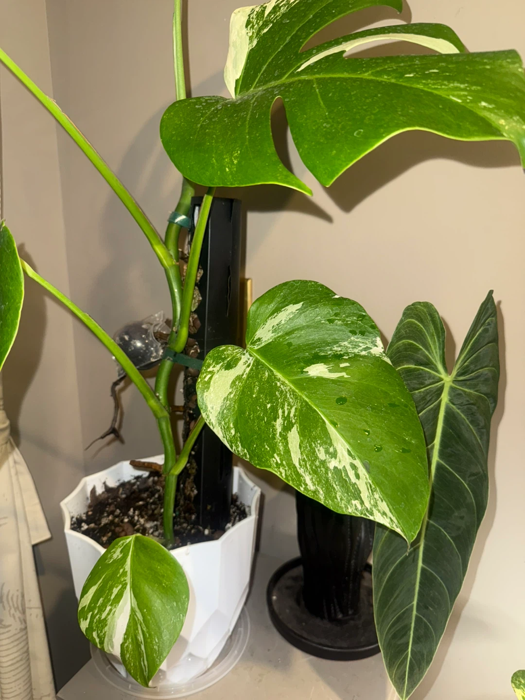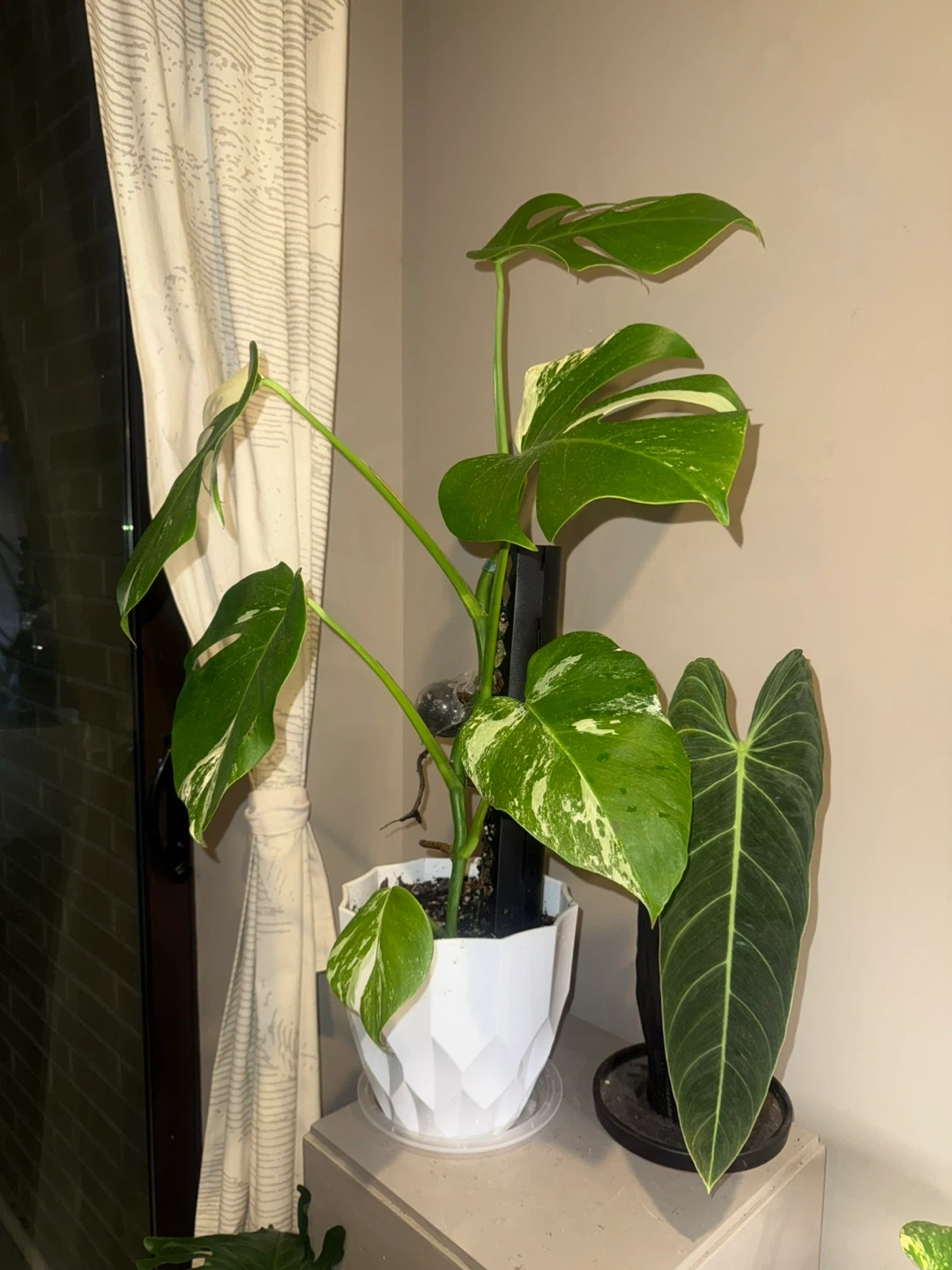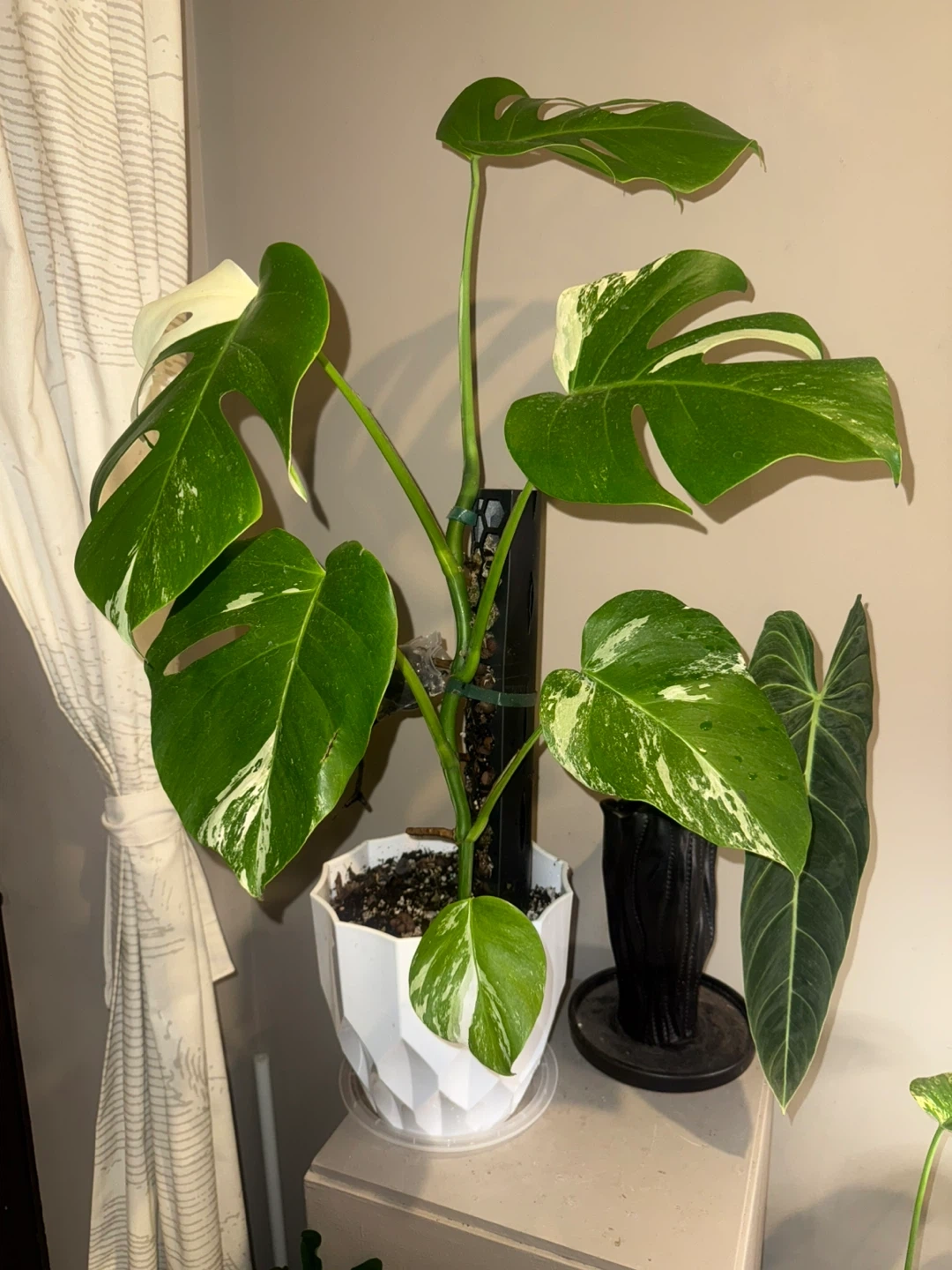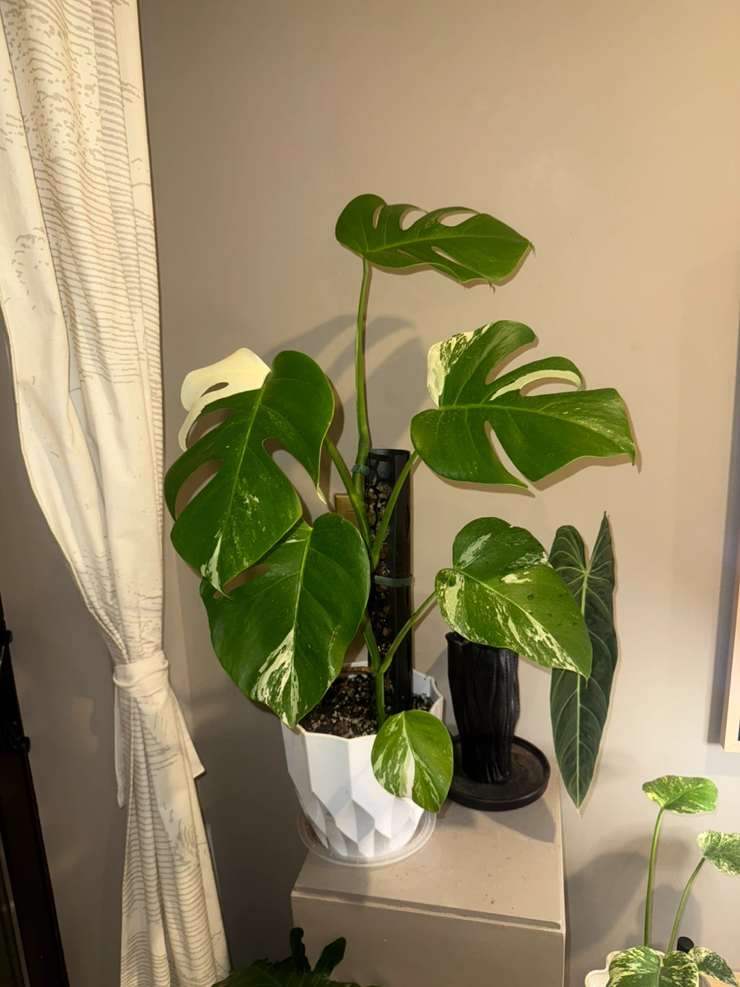 Selling a beautiful variegated Monstera Albo whole plant! 33” tall, It features stunning green and white leaves, making it a unique addition to any indoor space. This plant is healthy and well-cared for, ready to thrive in its new home. The white planter included.