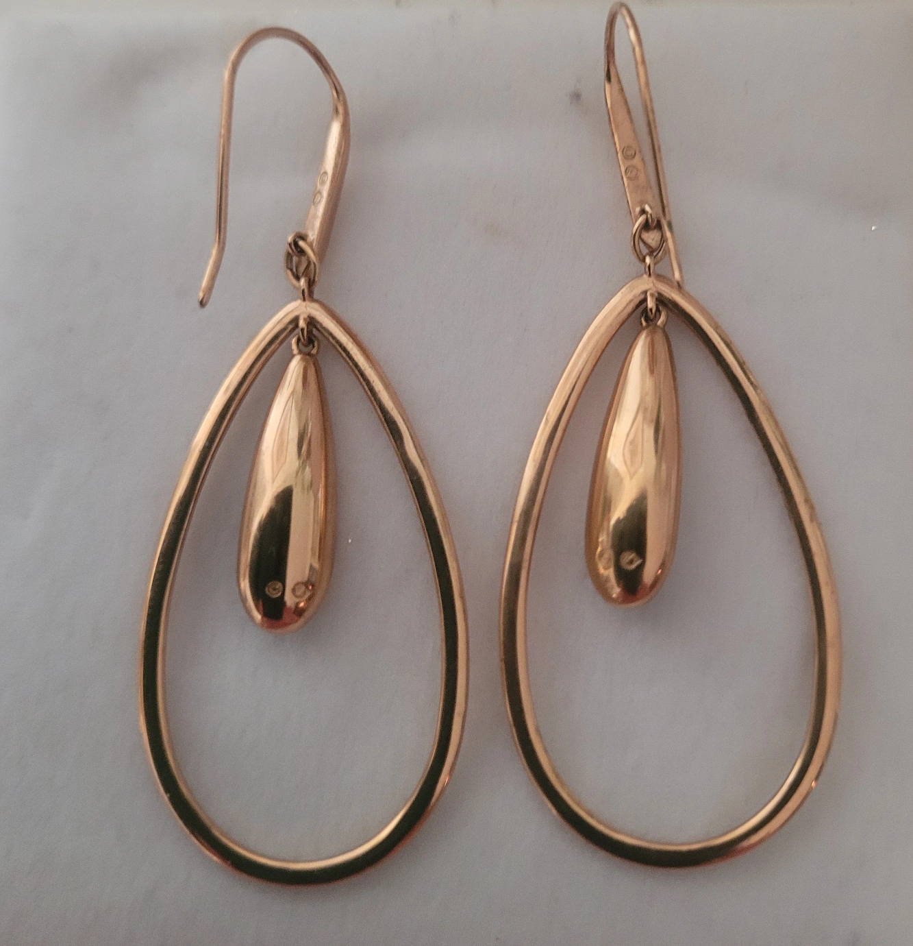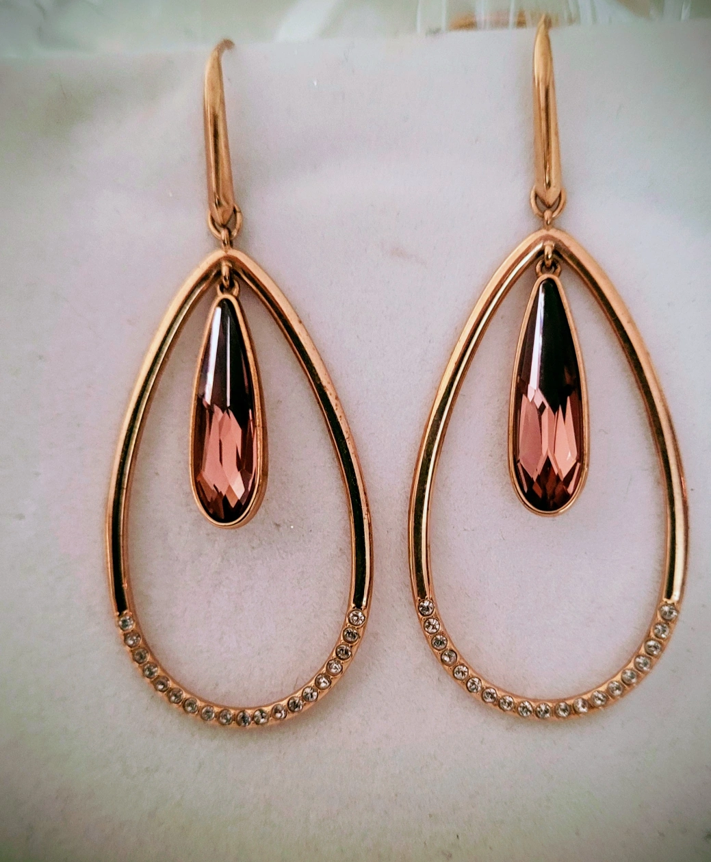 These are a beautiful pair of Swarovski drop earrings! They feature a rose gold finish and a teardrop design. They're in great condition and would make a lovely addition to any jewelry collection