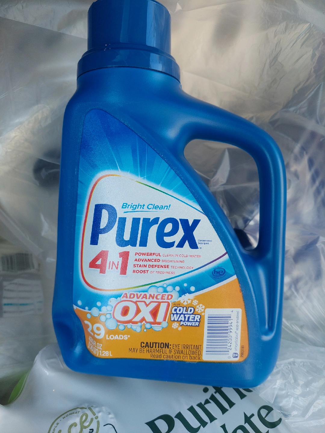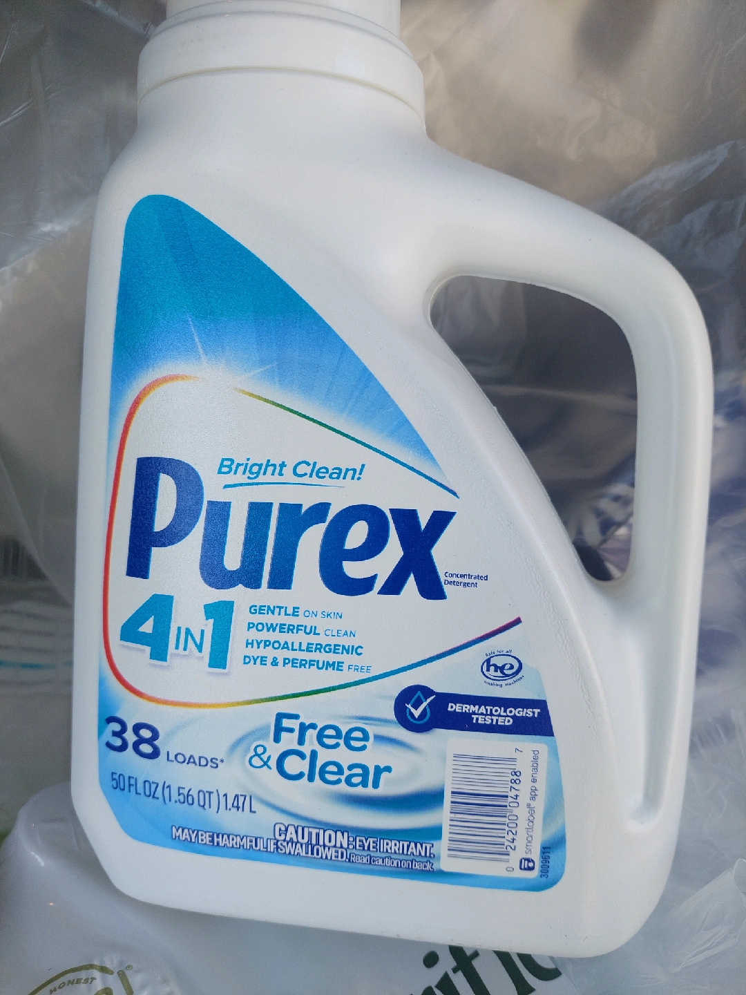 26I have a bottle of Purex 4 in 1 laundry detergent for sale. It's the kind that's gentle on skin, hypoallergenic, and free of dyes and perfumes. It has 38 loads worth!