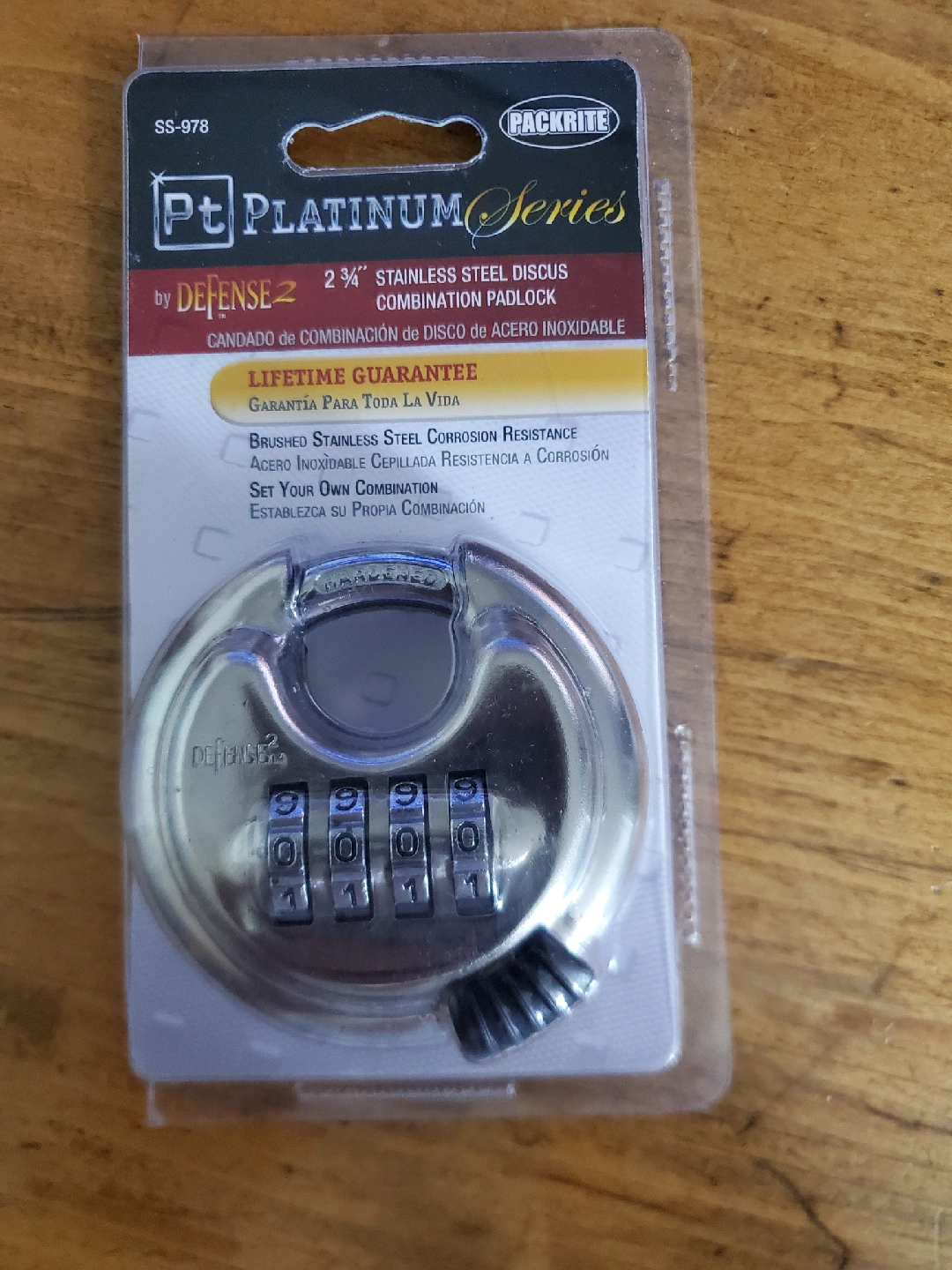 Selling a brand new Packrite Platinum Series 2 3/4" stainless steel discus combination padlock. It features a lifetime guarantee and brushed stainless steel corrosion resistance. Set your own combination and keep your belongings safe and secure!