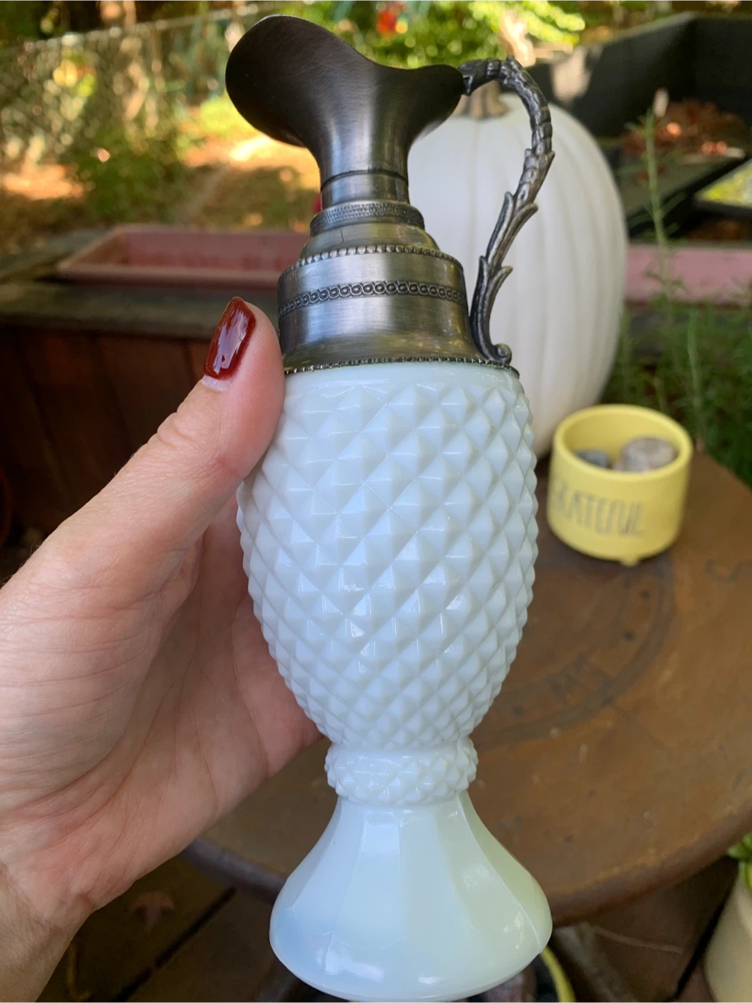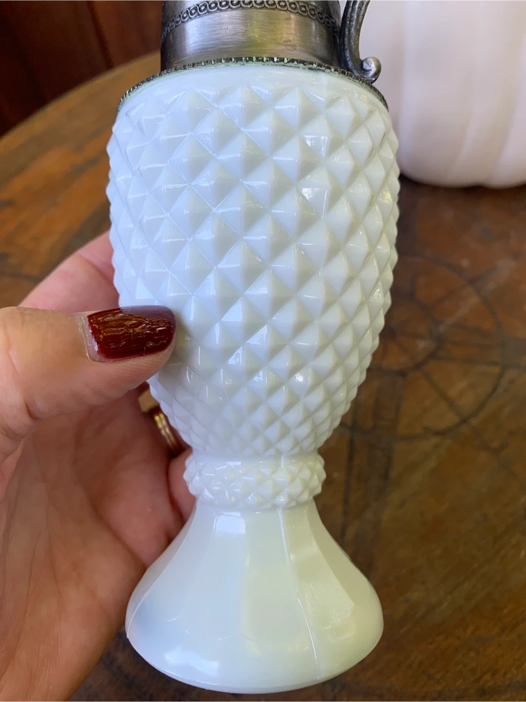 Here's a lovely vintage milk glass pitcher/ bud vase with a decorative metal handle! It features opaline vintage milk glass with a diamond pattern to it. It's in great shape with no cracks or chips, and would look beautiful on any table or shelf. A very unique decor piece!