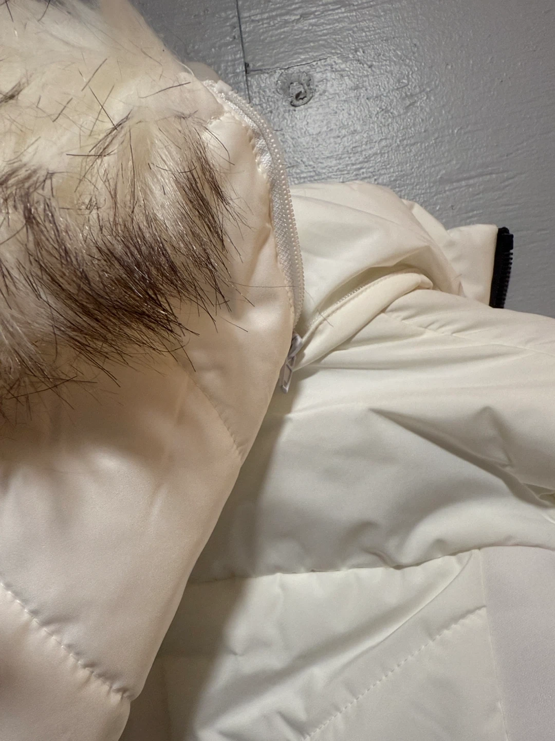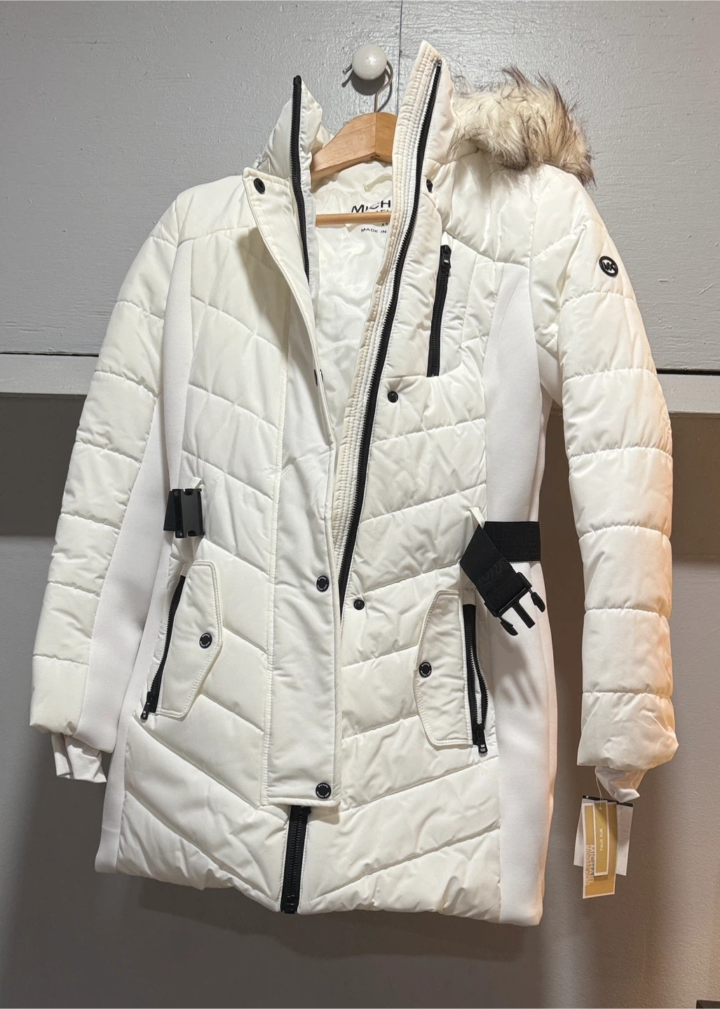 Selling a Michael Michael Kors white winter coat in size XS! The exterior is 100% polyester, and the lining is also 100% polyester. The coat features a stylish design and is perfect for staying warm during the colder months. Brand new