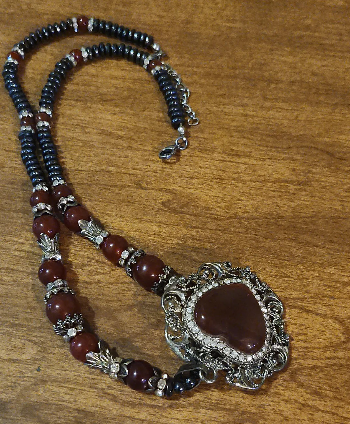 This is a beaded necklace featuring a large pendant. The pendant has a brown stone in the center surrounded by rhinestones and an ornate silver-tone setting. The beads are a mix of brown, black, and silver colors.