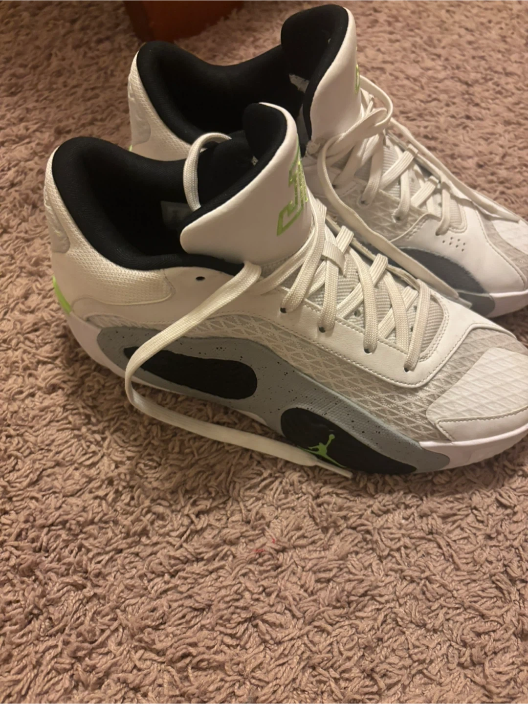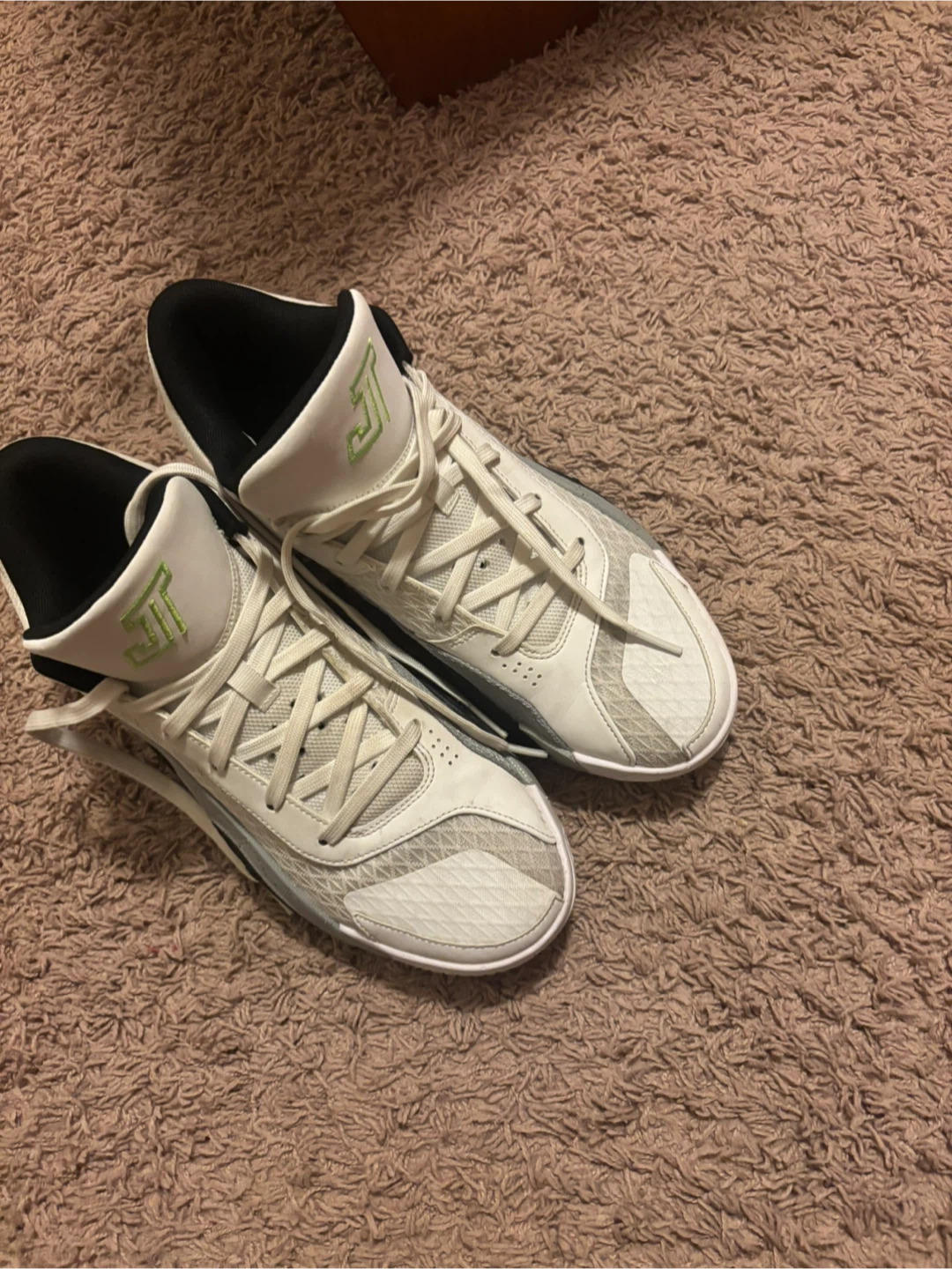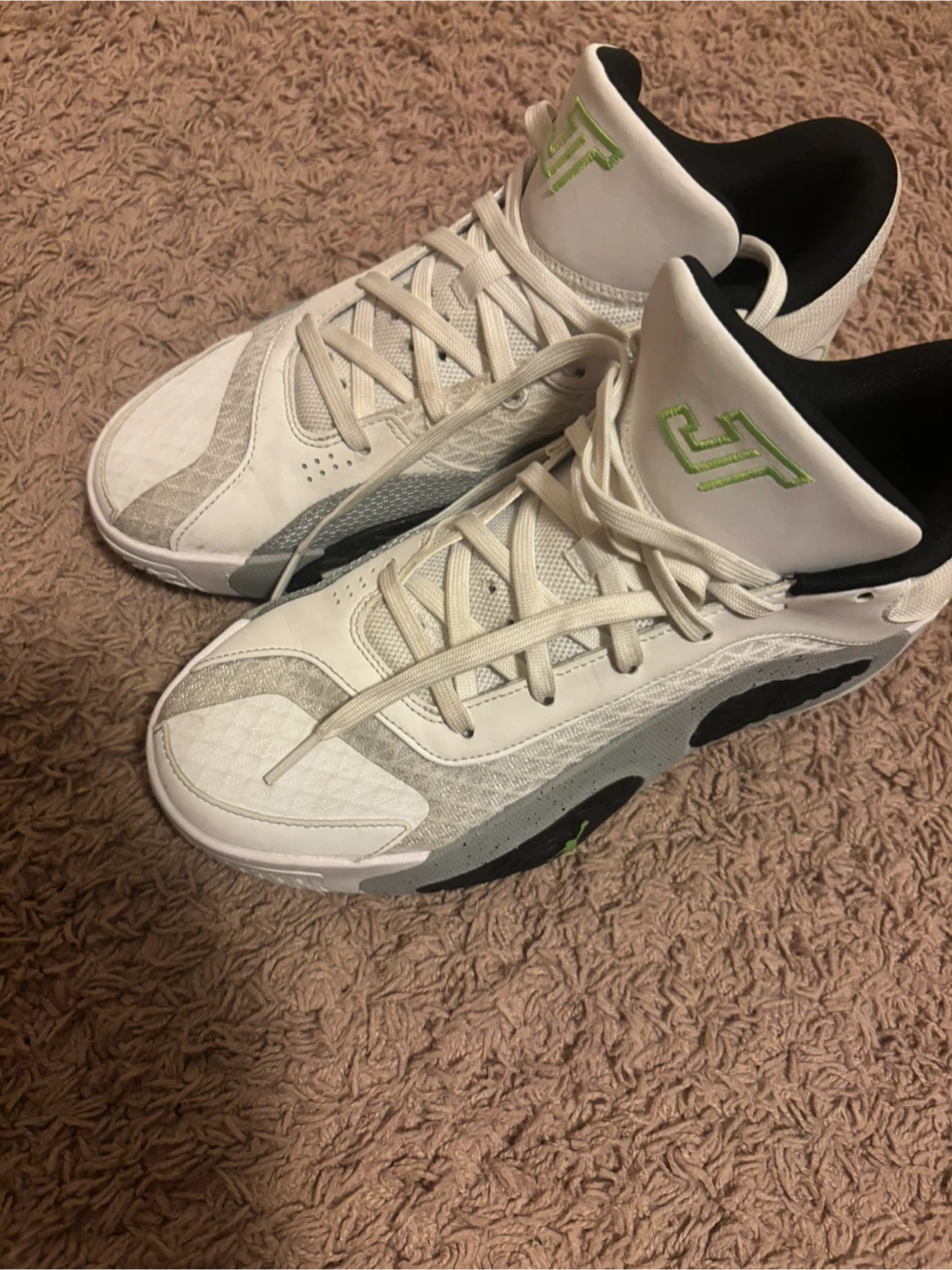 Selling a pair of Jordan Tatum 1 'Denim' basketball shoes. They feature a white, grey, and black colour scheme with lime green accents. Great for on the court or casual wear! (Og Colorway).