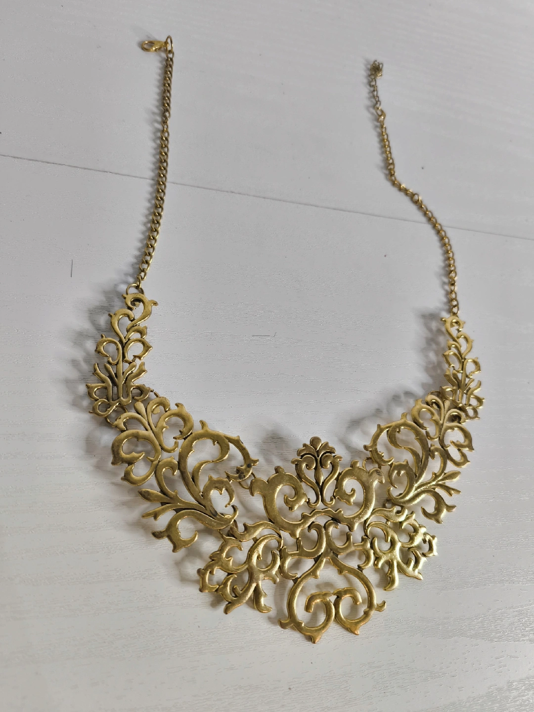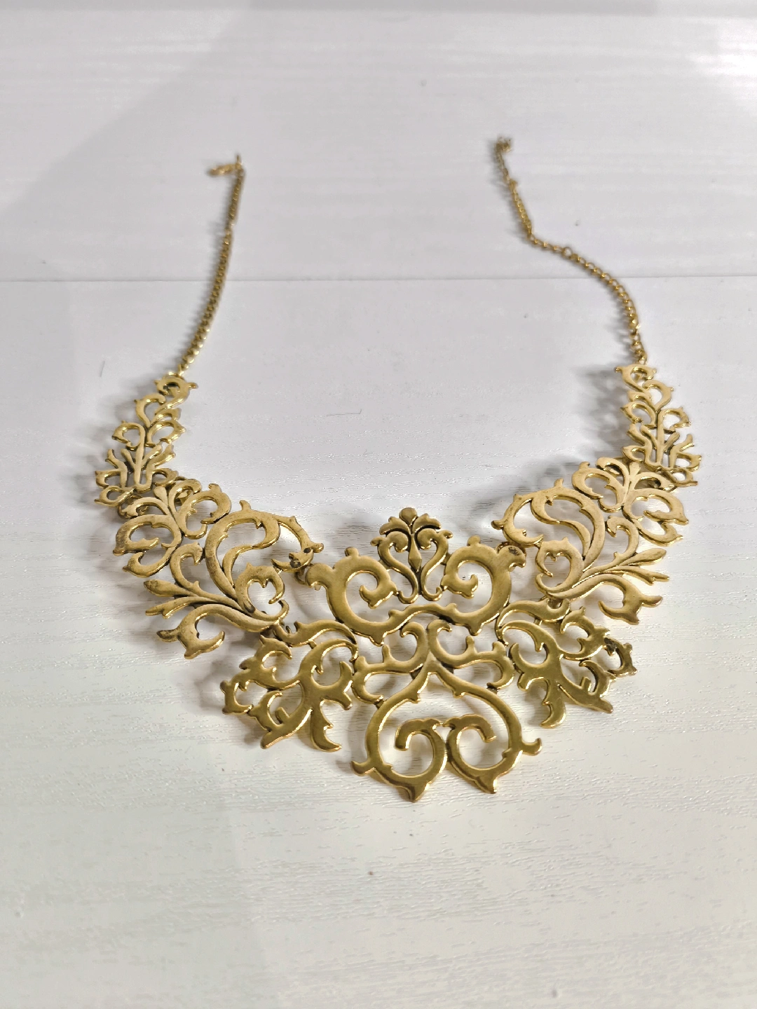 This is a beautiful gold-tone statement necklace with an ornate, filigree-style design.