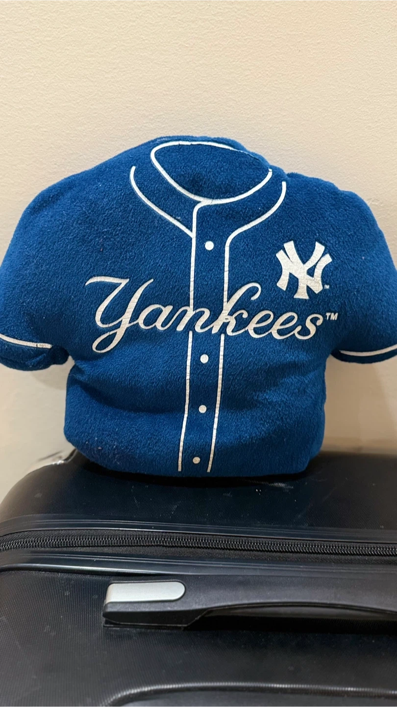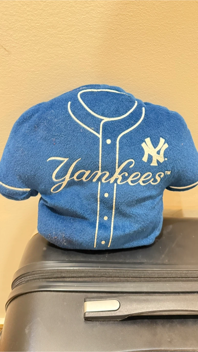 84Here's a fun New York Yankees baseball jersey pillow! It's blue with the Yankees logo and white accents. Perfect for any Yankees fan or as a decorative pillow