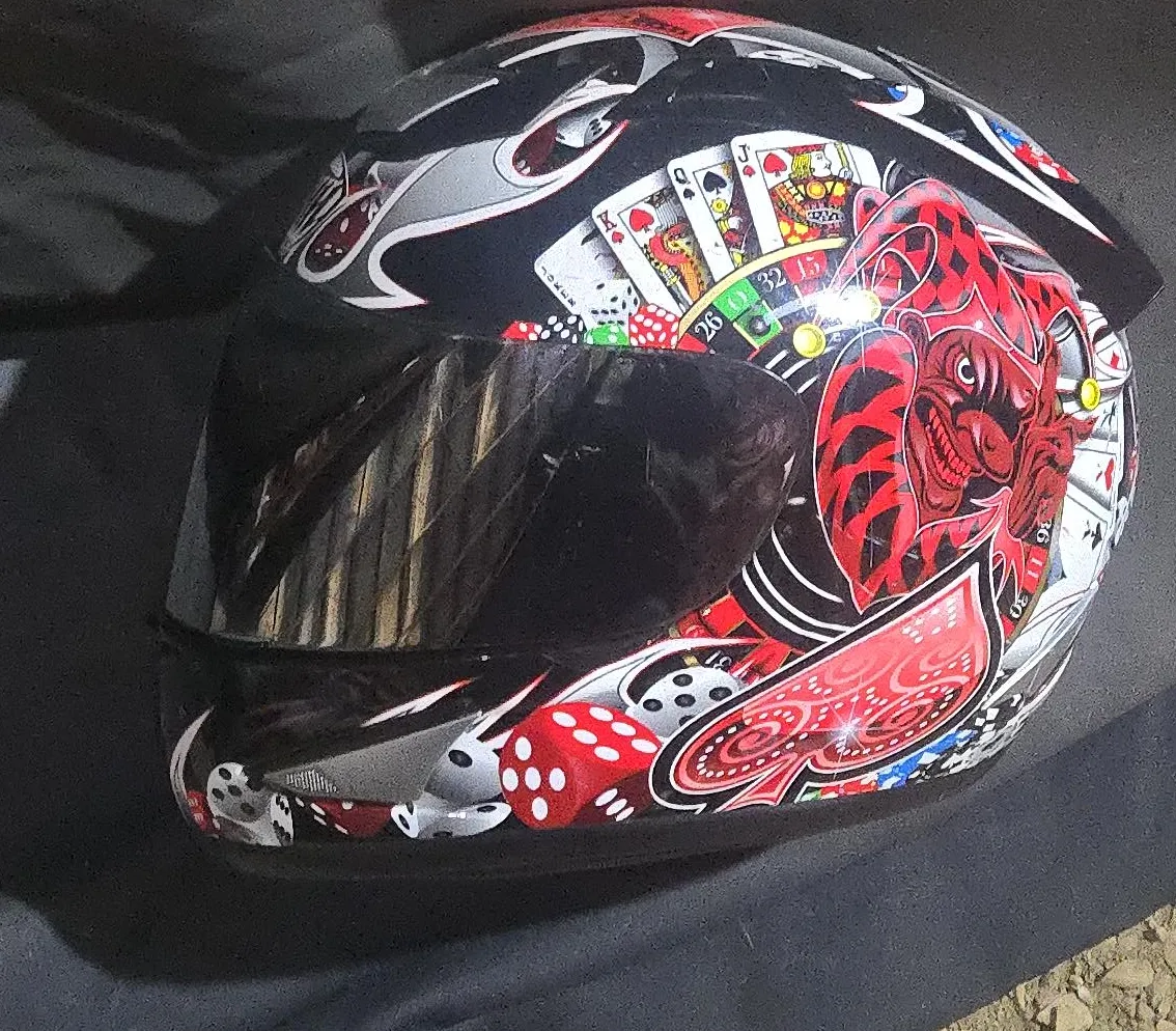 Selling a motorcycle helmet with a unique casino-themed design. It features playing cards, dice, and a roulette wheel motif. The helmet appears to be in good condition. Perfect for riders who want to stand out!