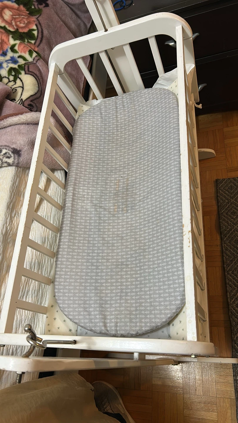Thrifty Pick π₯ Here's a white bassinet for your little one! It's in good condition just has a few scratches but a simple paint will make in brand new and ready for a new home. The bassinet has a grey patterned mattress pad included.