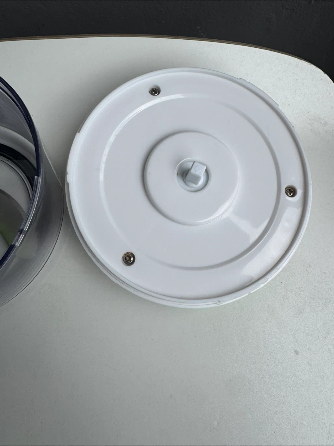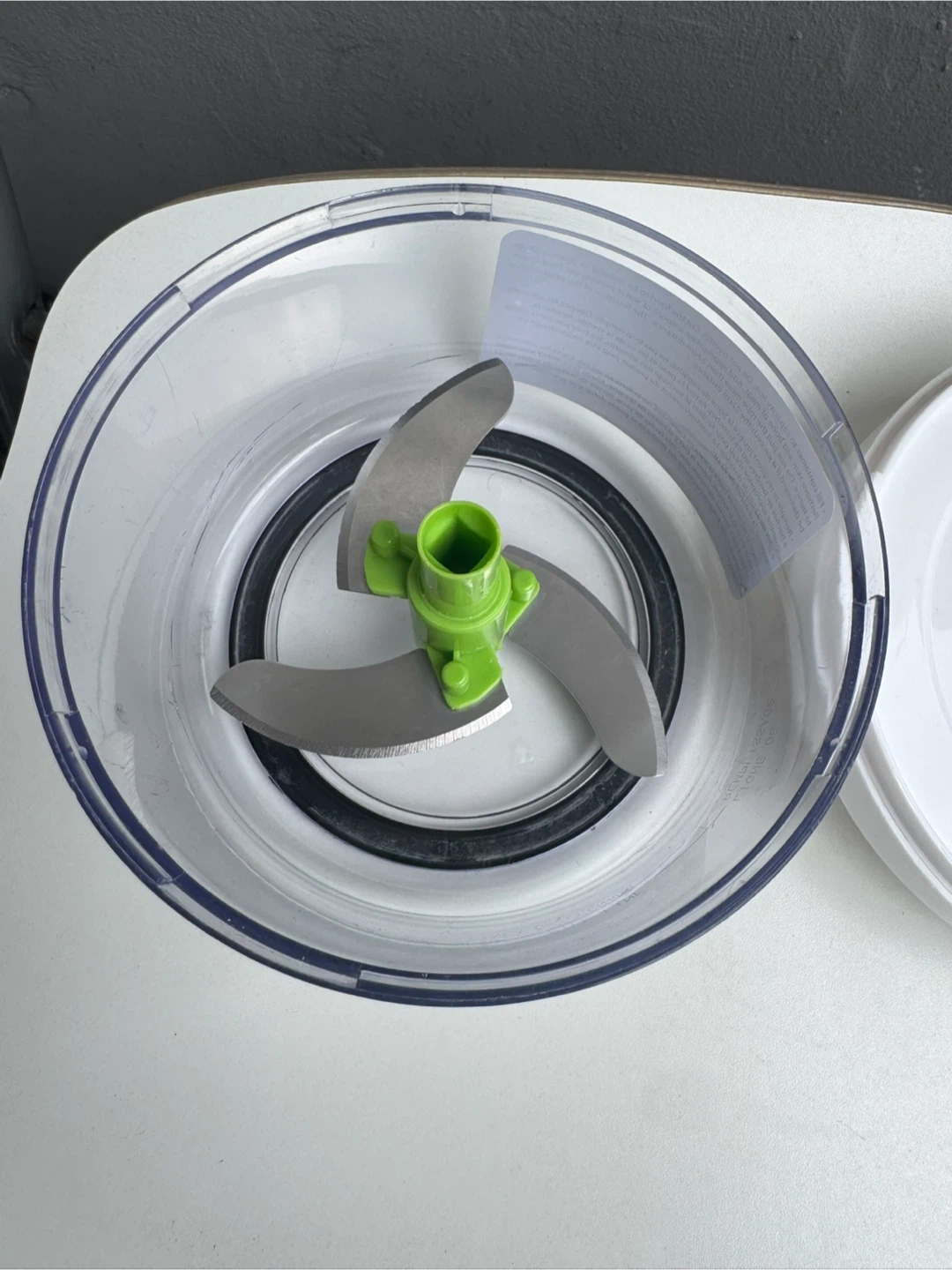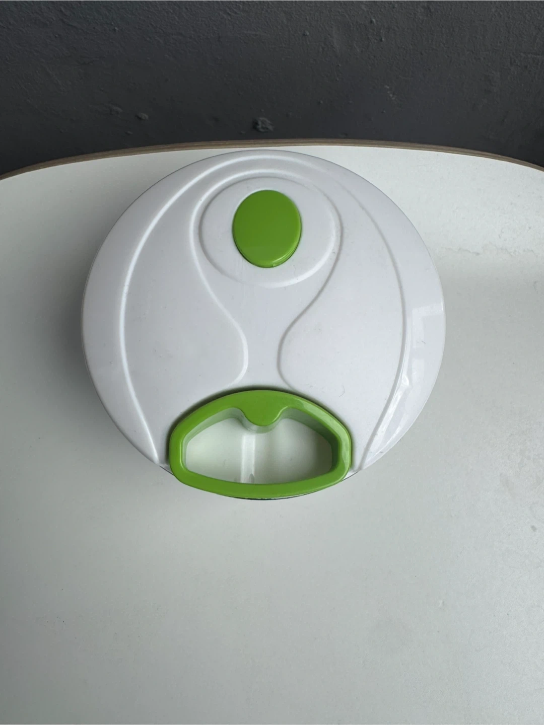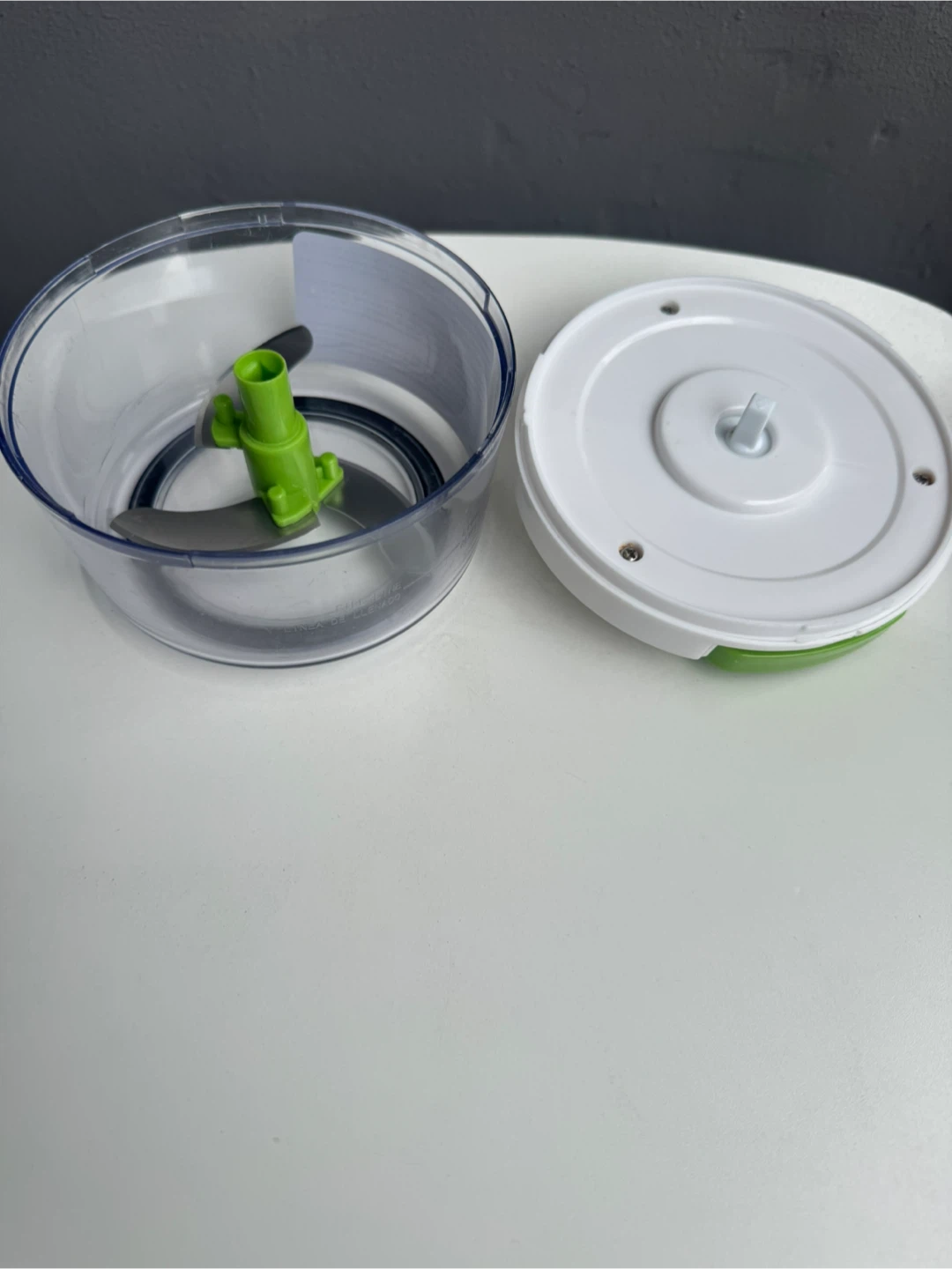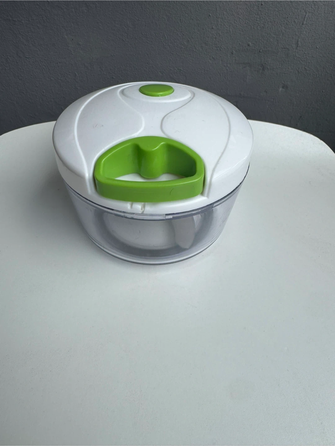 This is a handy food chopper in great condition! It features a clear plastic bowl, a white lid, and a green handle. It's perfect for quickly chopping vegetables, fruits, and more
