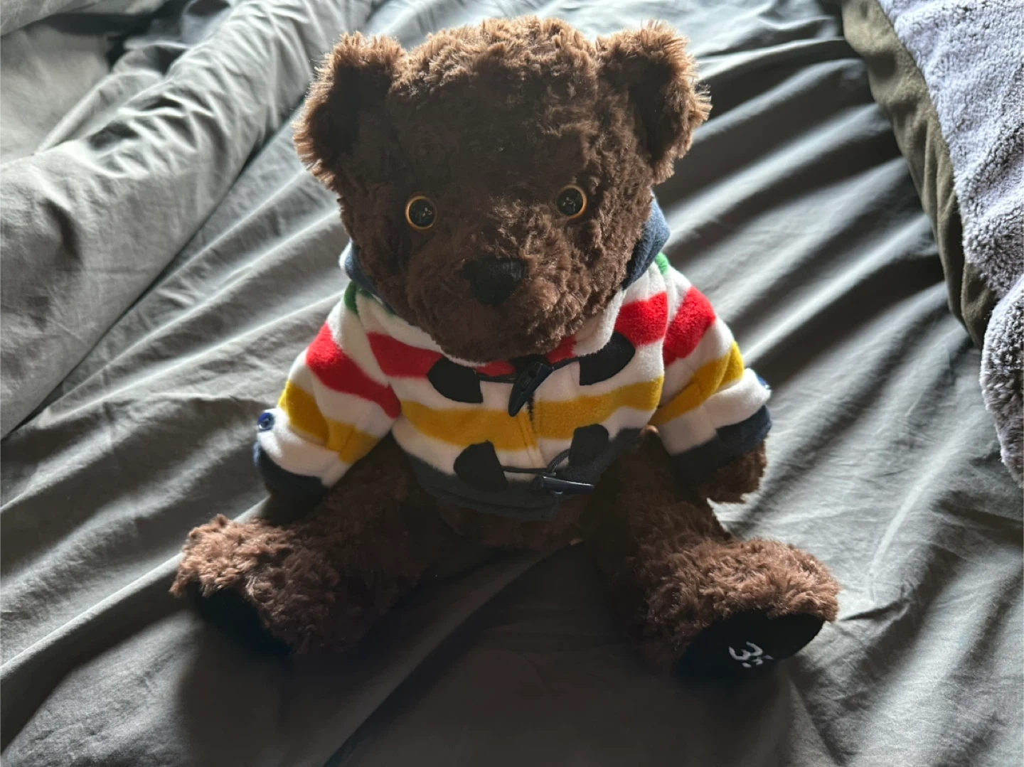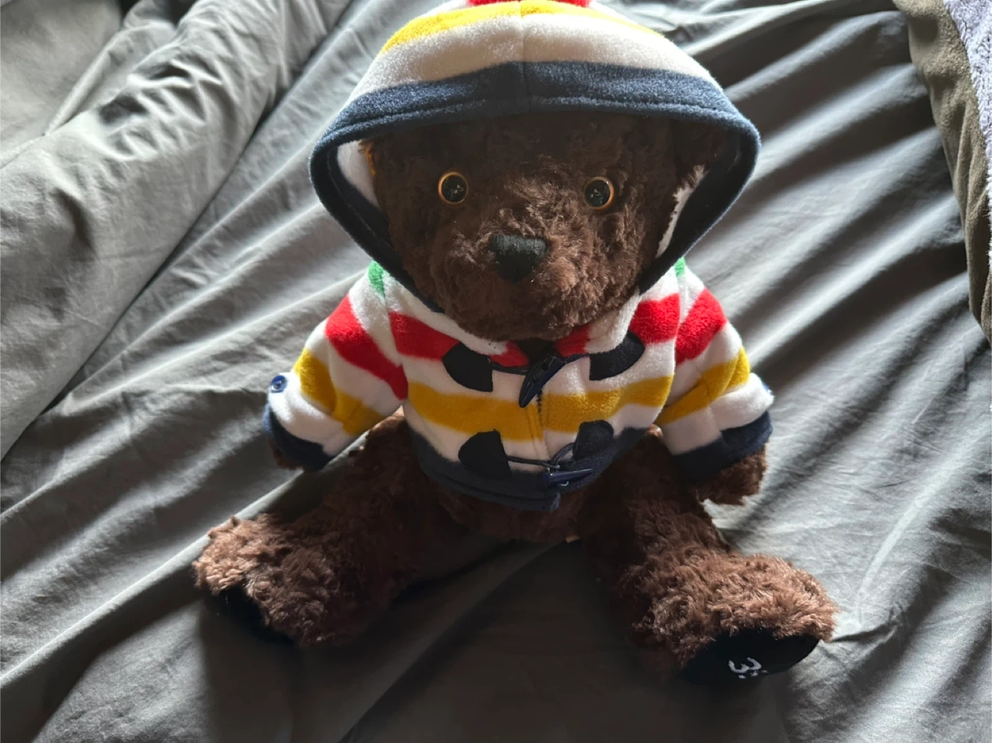 Selling a cute Hudson's Bay Company teddy bear! It's in great condition and ready for a new home. The bear is wearing a colorful striped jacket with hoodie. 2020 edition named Patrick.