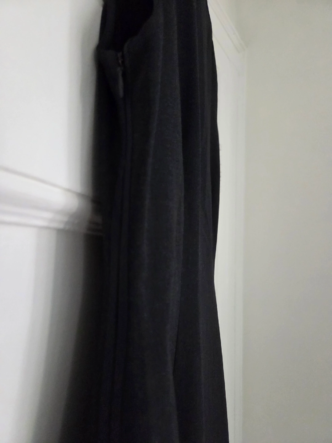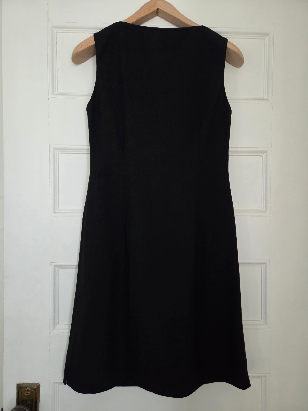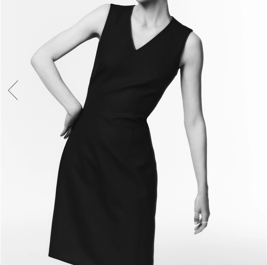 Like-new condition. This beautifully tailored dress features a flattering V-neck, subtle side zipper and side slits on both sides for easy movement.