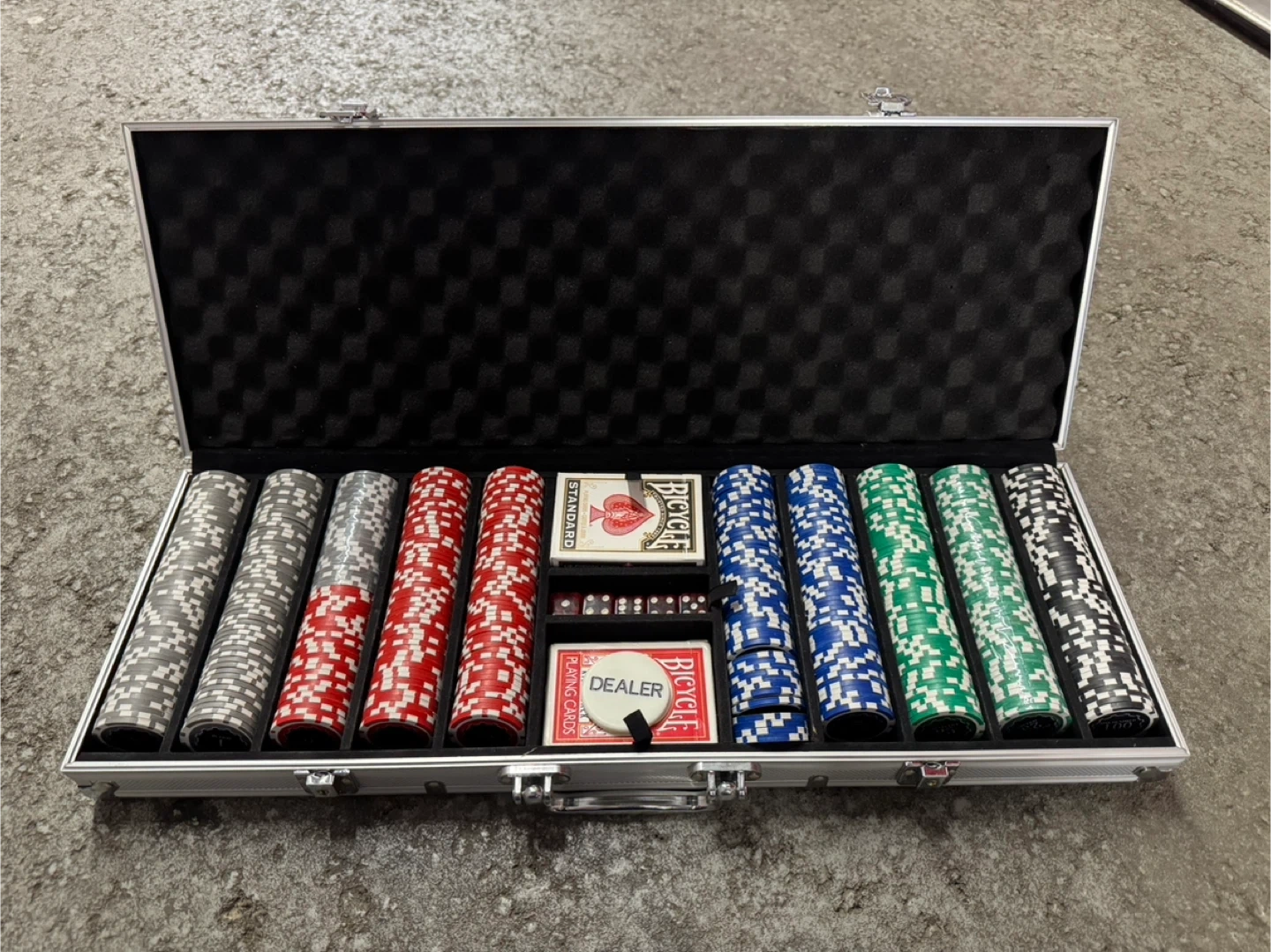 Selling a poker set that comes with a sturdy case to keep everything organized. It includes 3 sets of Bicycle playing cards, perfect for your next poker night with friends!