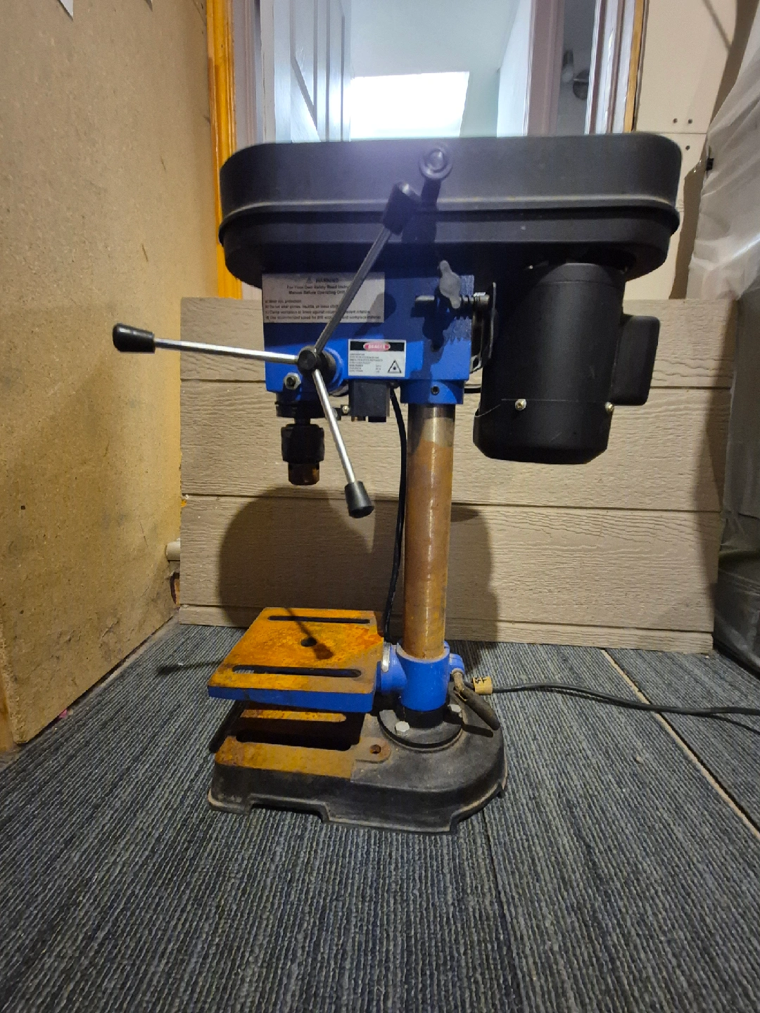 Selling a 5-speed drill press, model ZJ4113. It operates at 120V 60Hz 2.4A 300W and has a 1/2" max drilling diameter. The spindle speed ranges from 780 to 3070 (min-1). Manufacturing date is 2005 August.