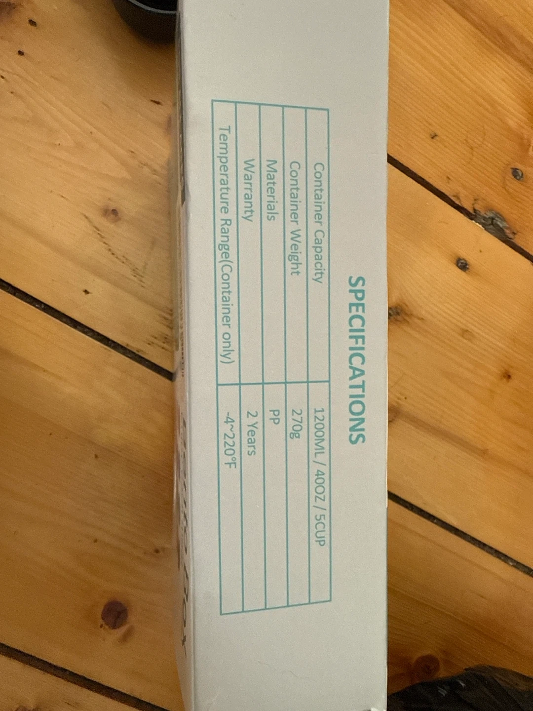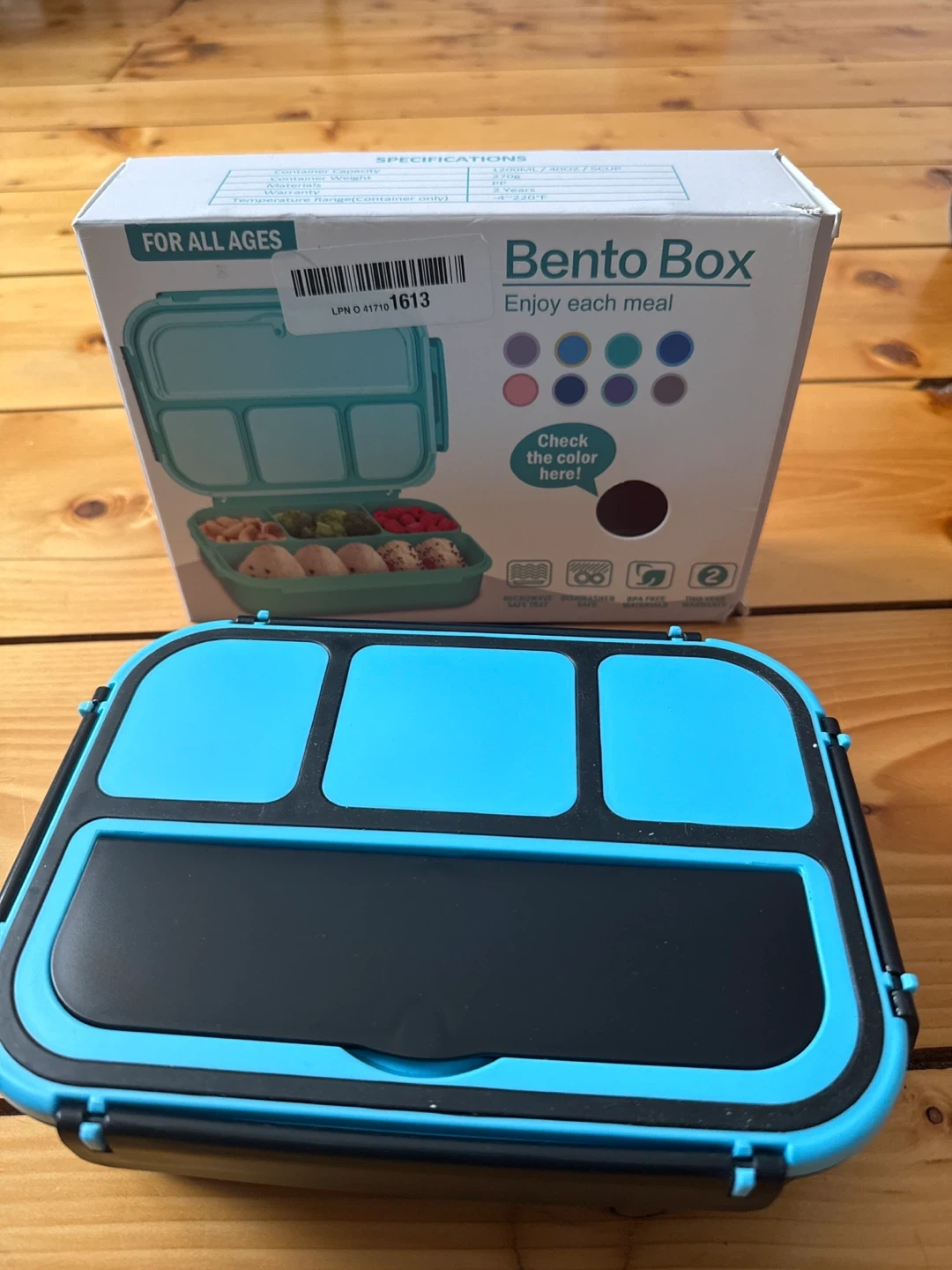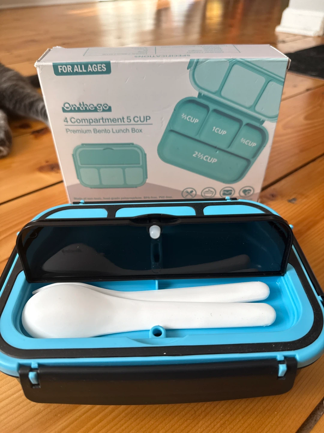 This is an "On-the-go" brand 4 compartment 5 cup premium bento lunch box. It's great for all ages! The container capacity is 1200ML/40OZ/5CUP. The box is included, and it's made of PP material and weighs 270g