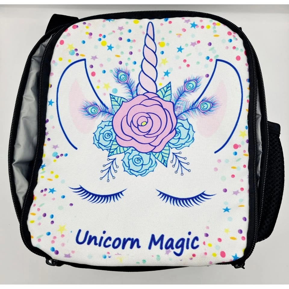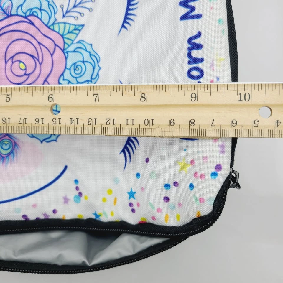 This insulated lunch bag features a whimsical unicorn design with vibrant colors. It's great for fitting in kids backpacks, and also great for road trips. Used it a handful of times with my little one. Pet free, smoke free home and cleaned. Measures 10"x8"x4"