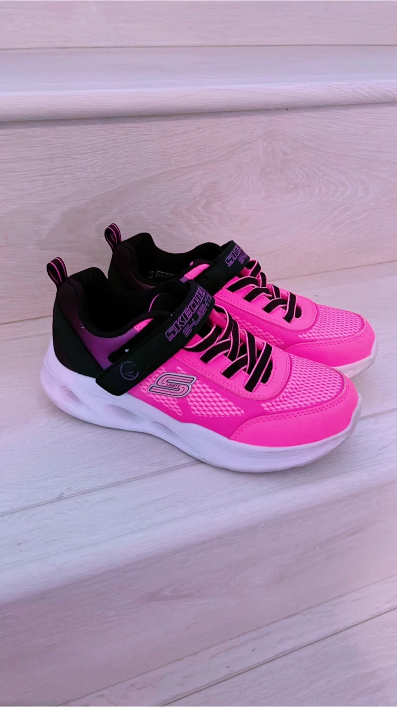 Selling a pair of Skechers S-Lights sneakers in a vibrant pink colour! These shoes are perfect for adding a pop of colour to any outfit. They feature black laces and accents, and a comfortable white sole. Great for everyday wear! Size Us 2
