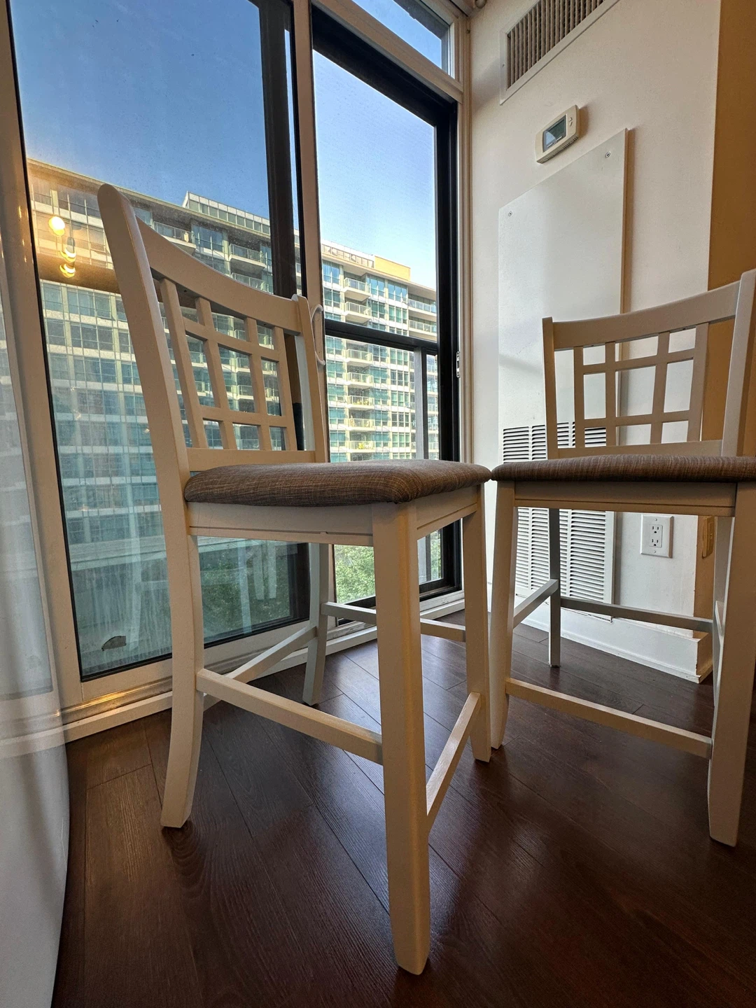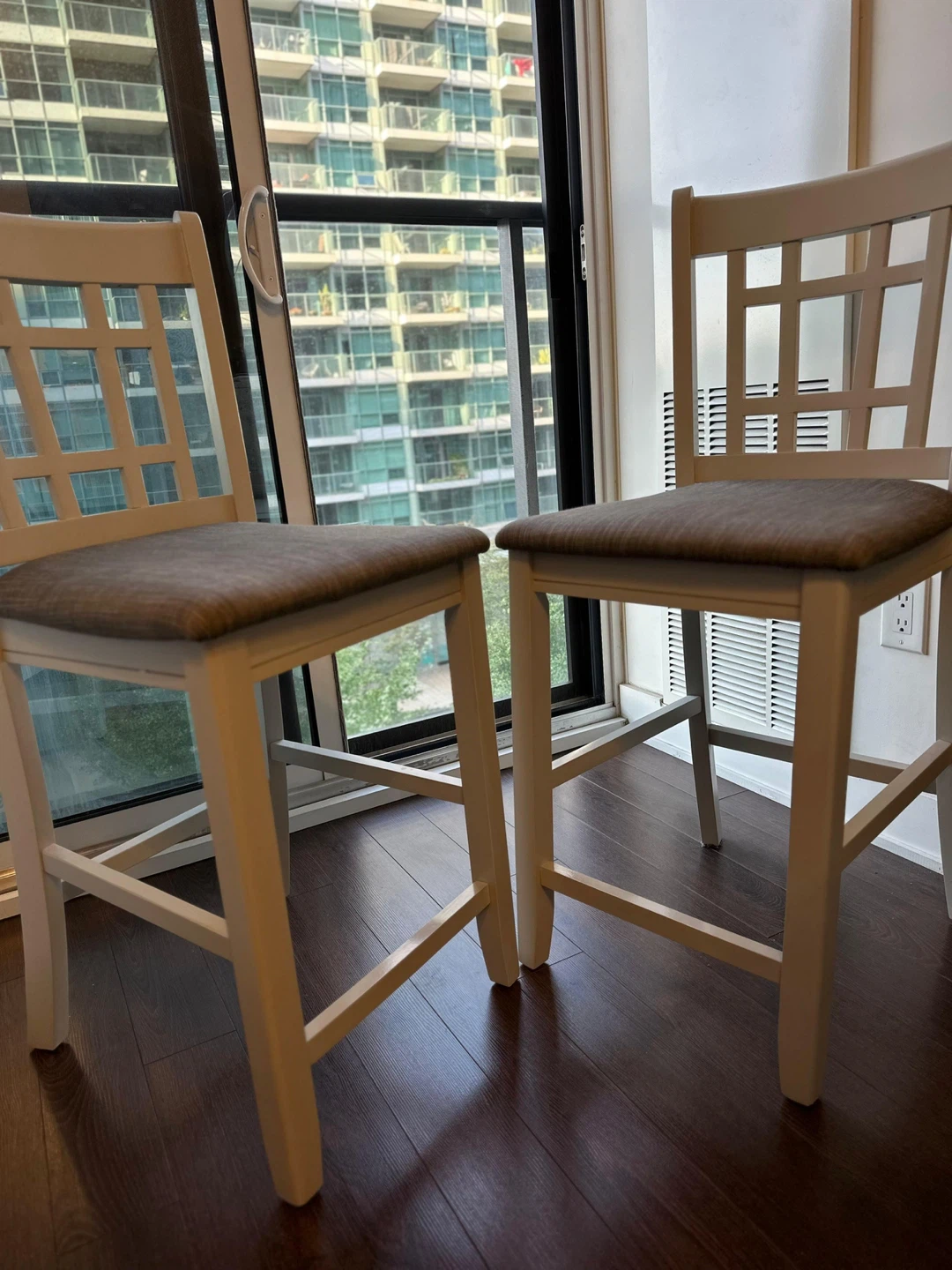 Selling a set of two bar stools. They are white with a woven seat. They are in great condition and would look great in any kitchen or bar area