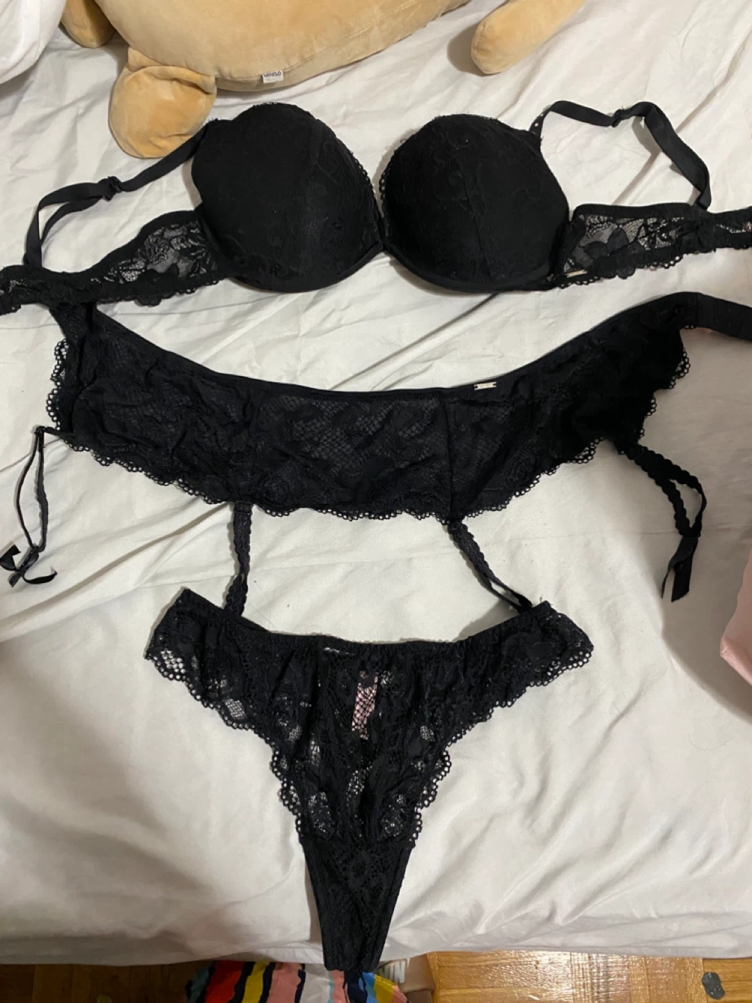 This set includes a bra (size 38C), a garter belt (size M/M), and matching underwear.