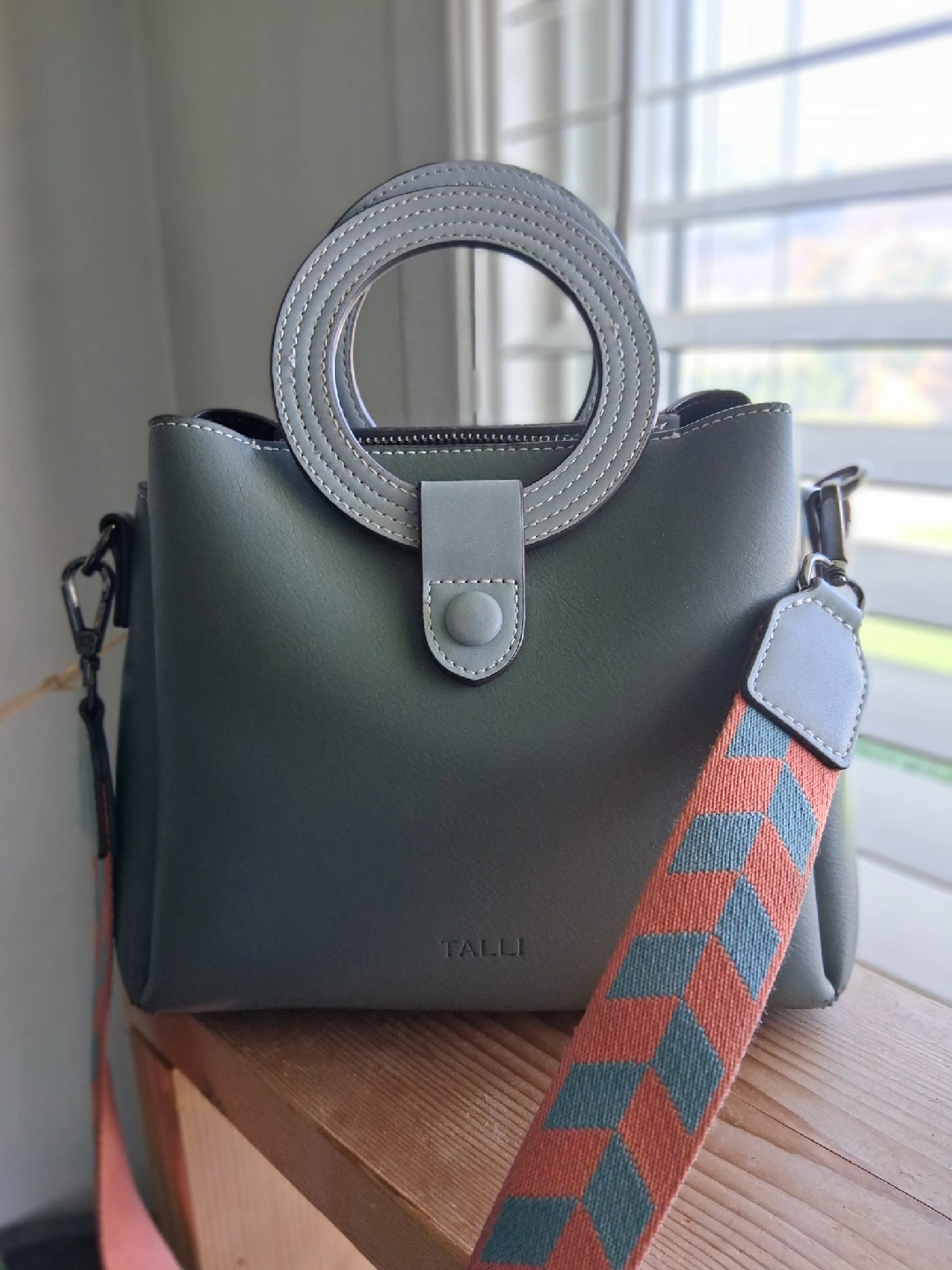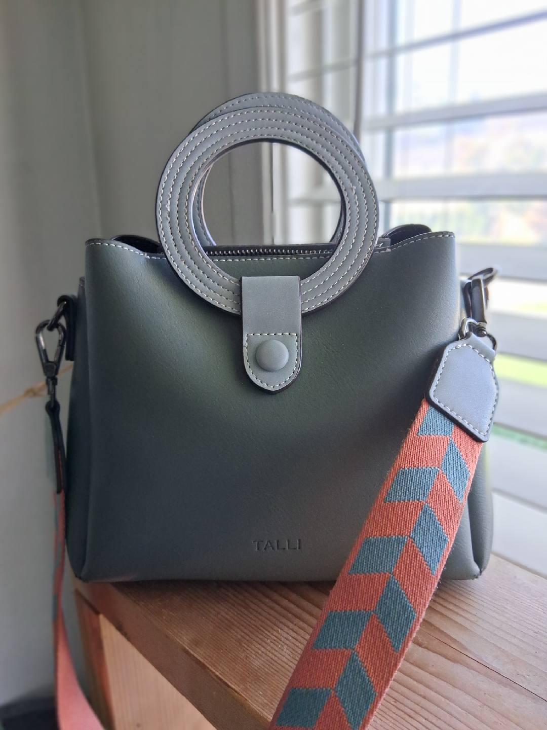 Selling a cute Talli handbag in a lovely olive green colour! It features a unique round handle and a stylish patterned strap. Great pockets for the necessities! Day or Evening bag.