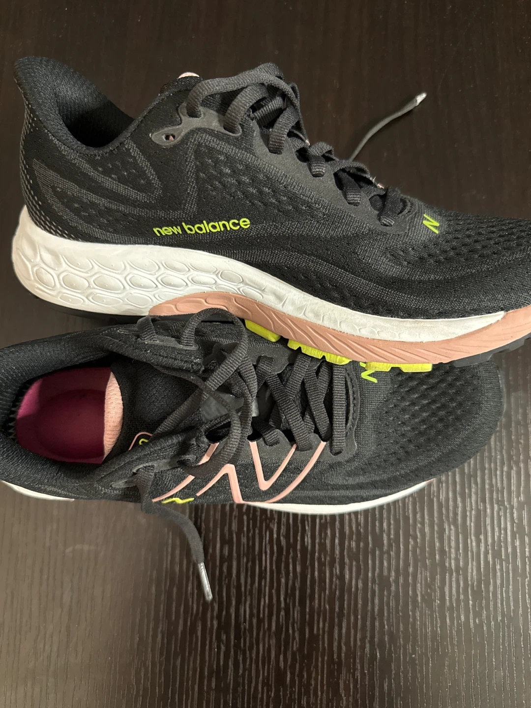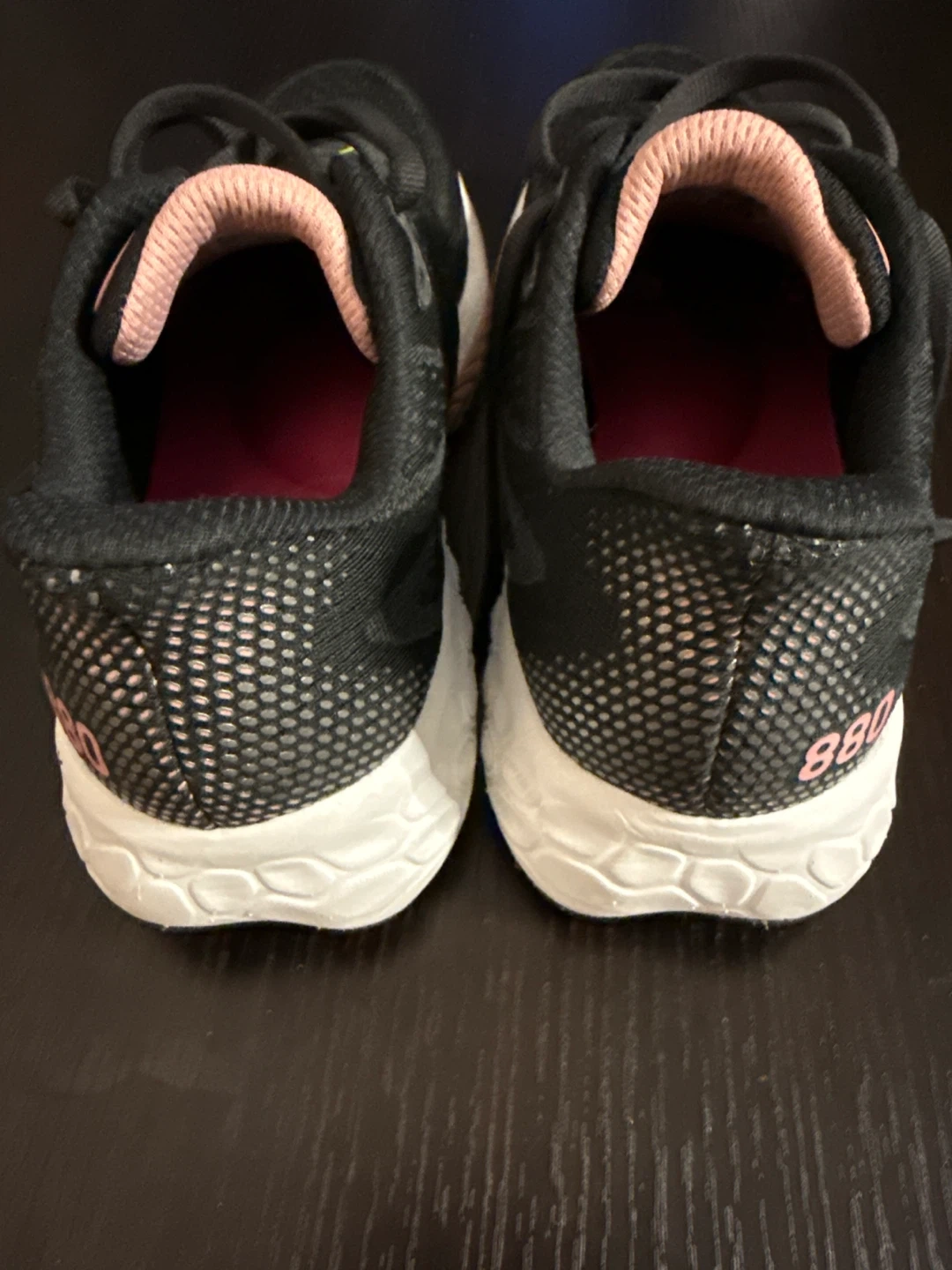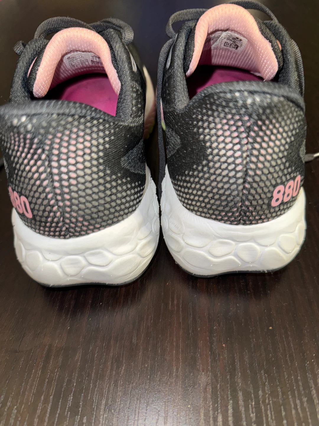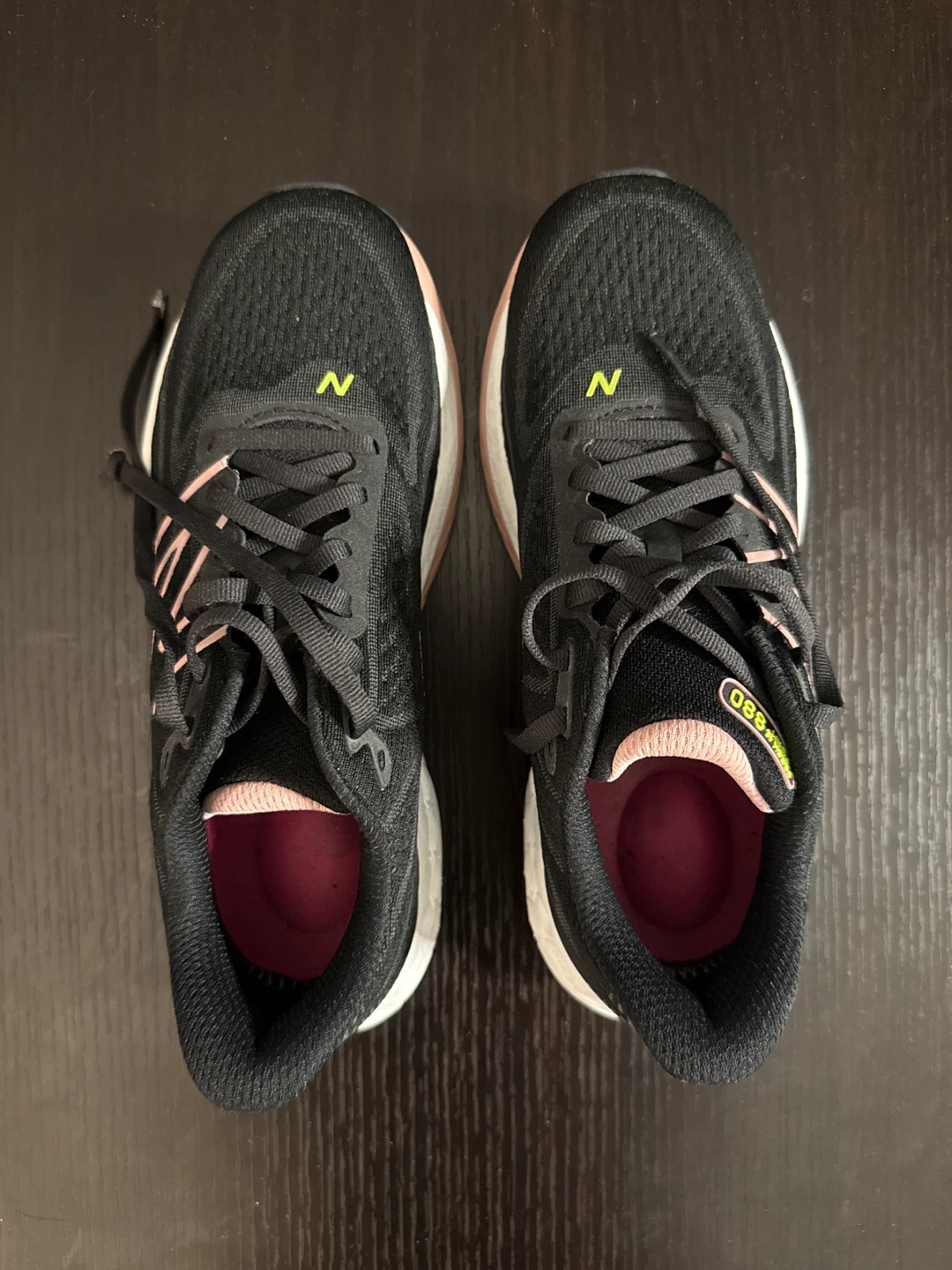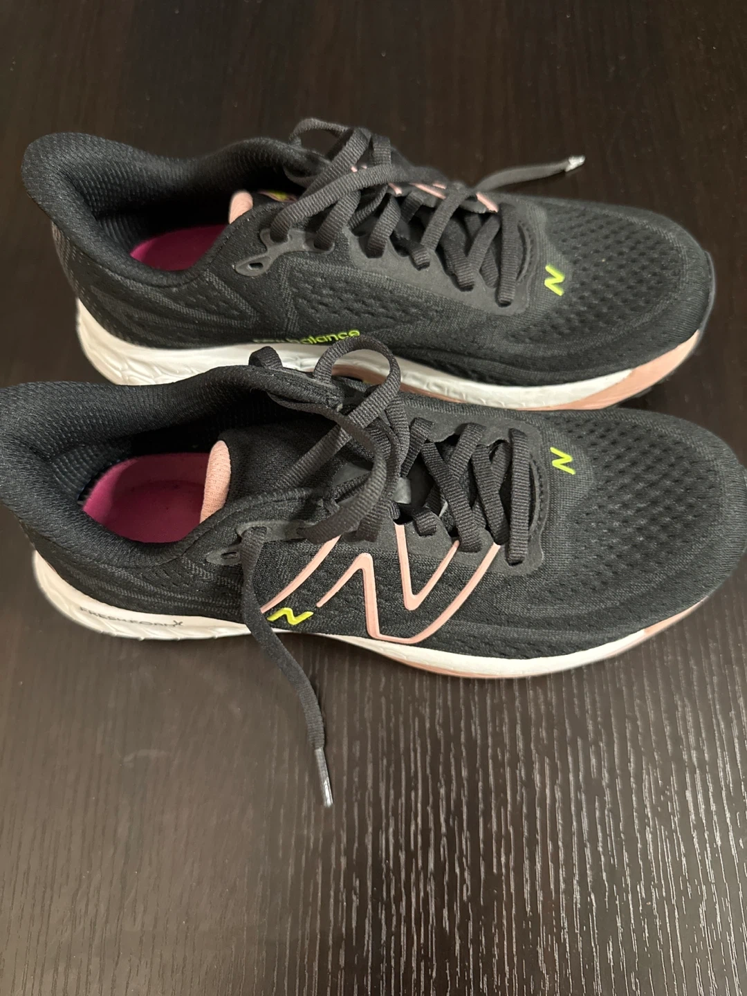 Selling a pair of New Balance Fresh Foam 880 running shoes. They're black with a pink interior and the New Balance logo in green. Great for running or everyday wear!