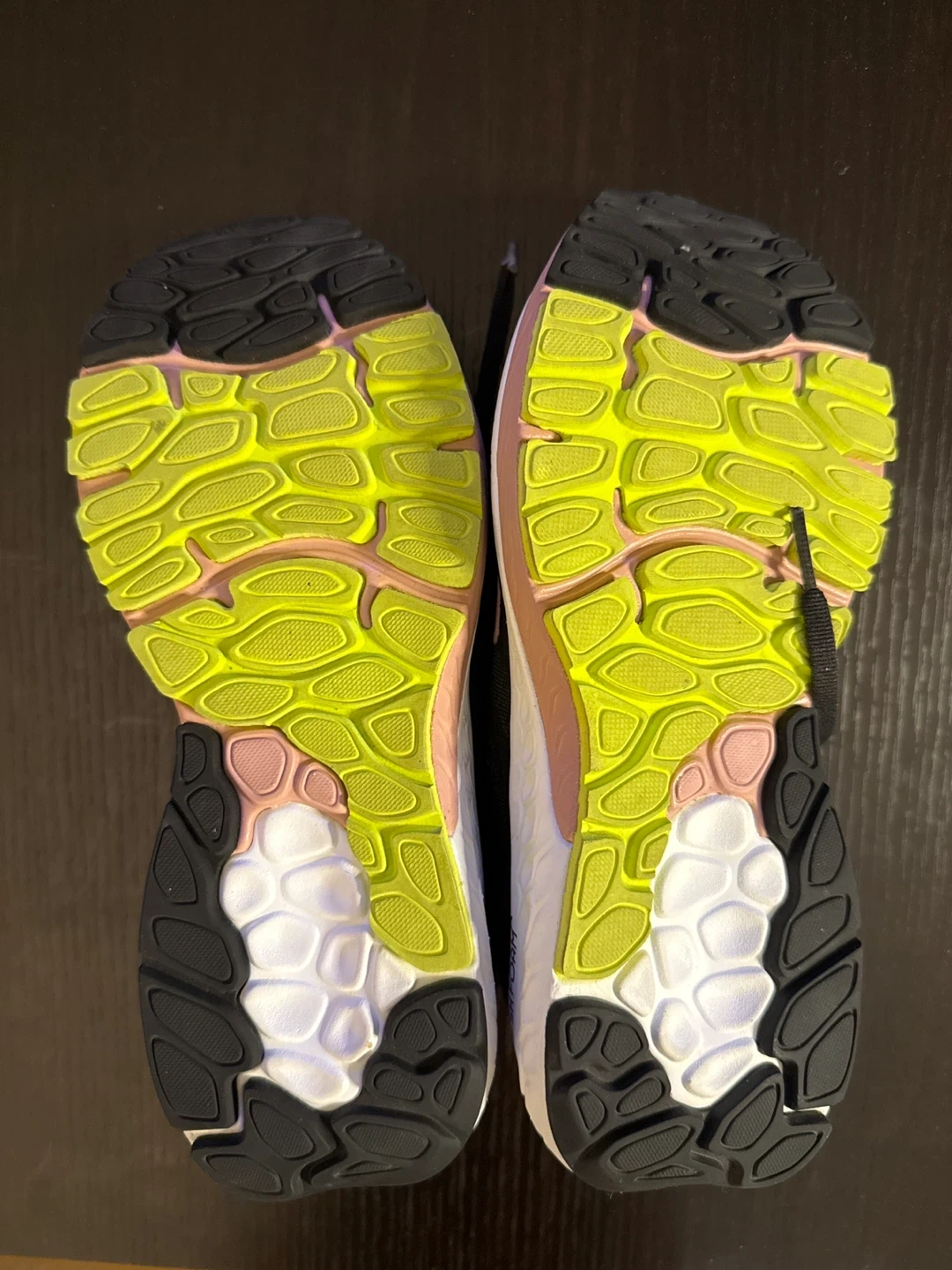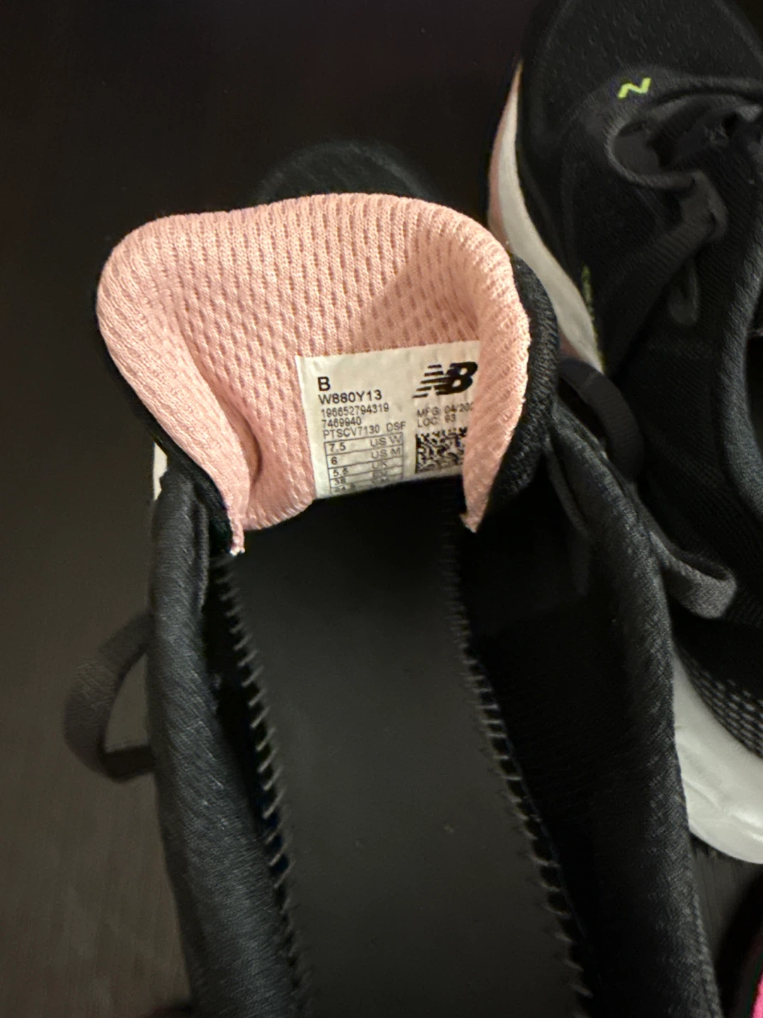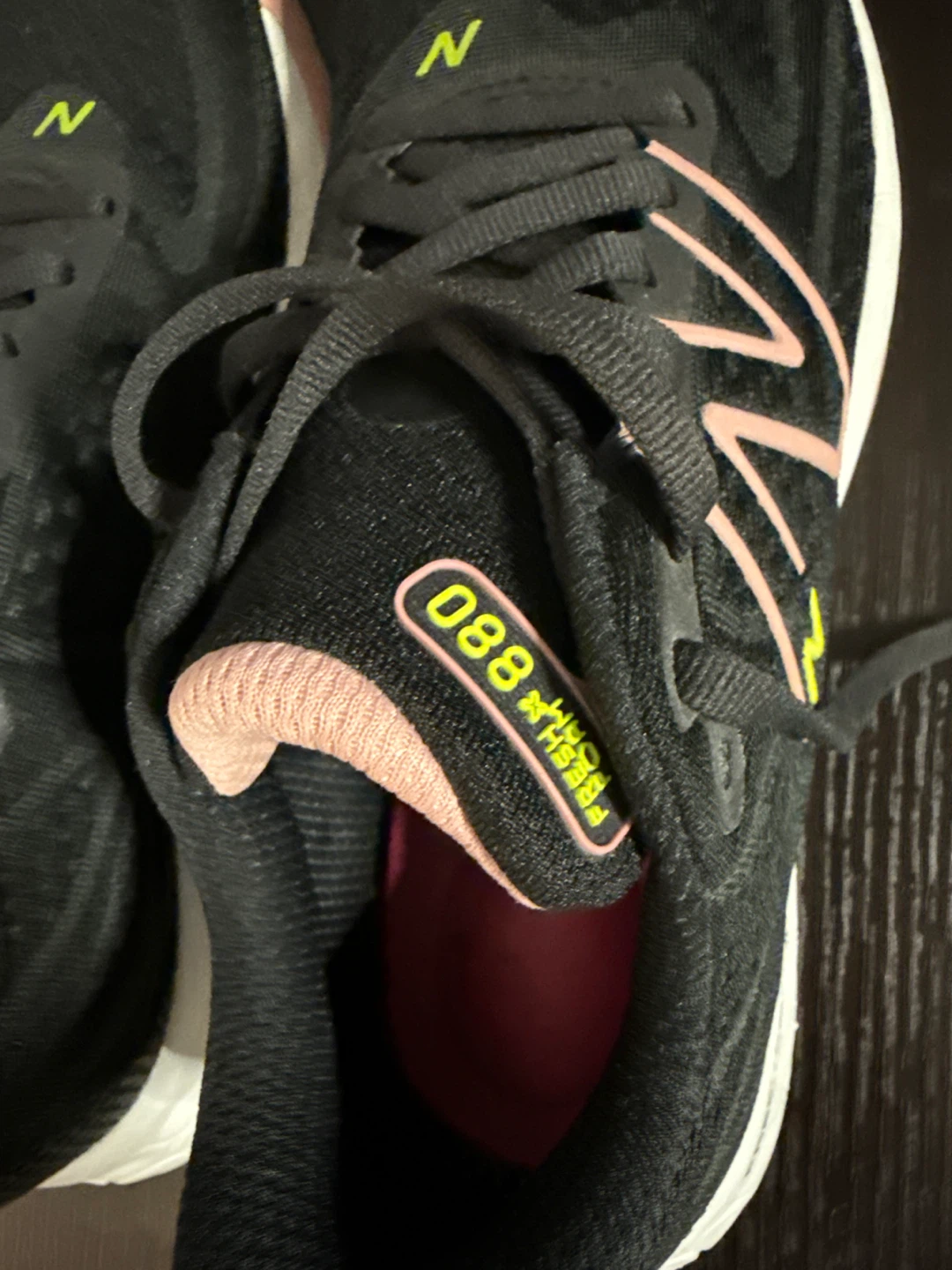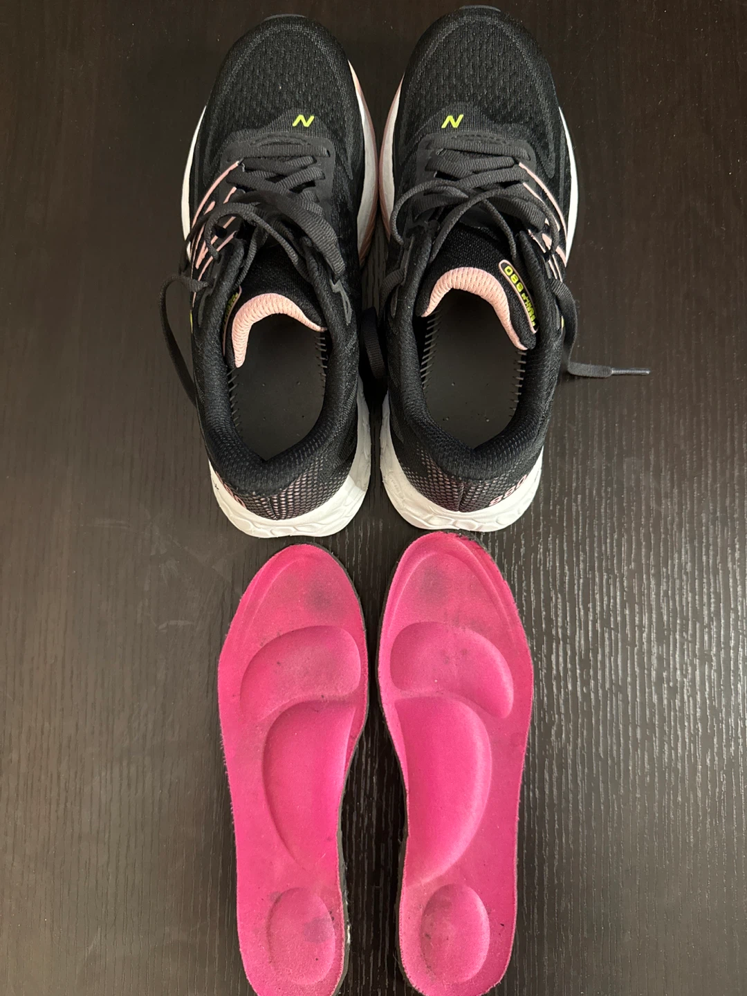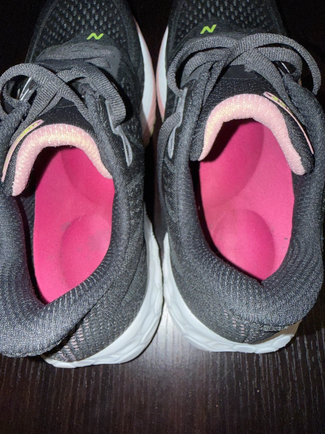Selling a pair of New Balance Fresh Foam 880 running shoes. They're black with a pink interior and the New Balance logo in green. Great for running or everyday wear!