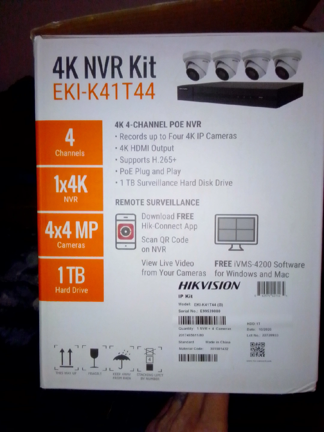 Selling a Hikvision 4K NVR Kit, model EKI-K41T44. It's a 4-channel PoE NVR that records up to four 4K IP cameras. It also has a 4K HDMI output and supports H.265+. This kit includes a 1 TB surveillance hard drive for recording your footage. Great for home or business security!