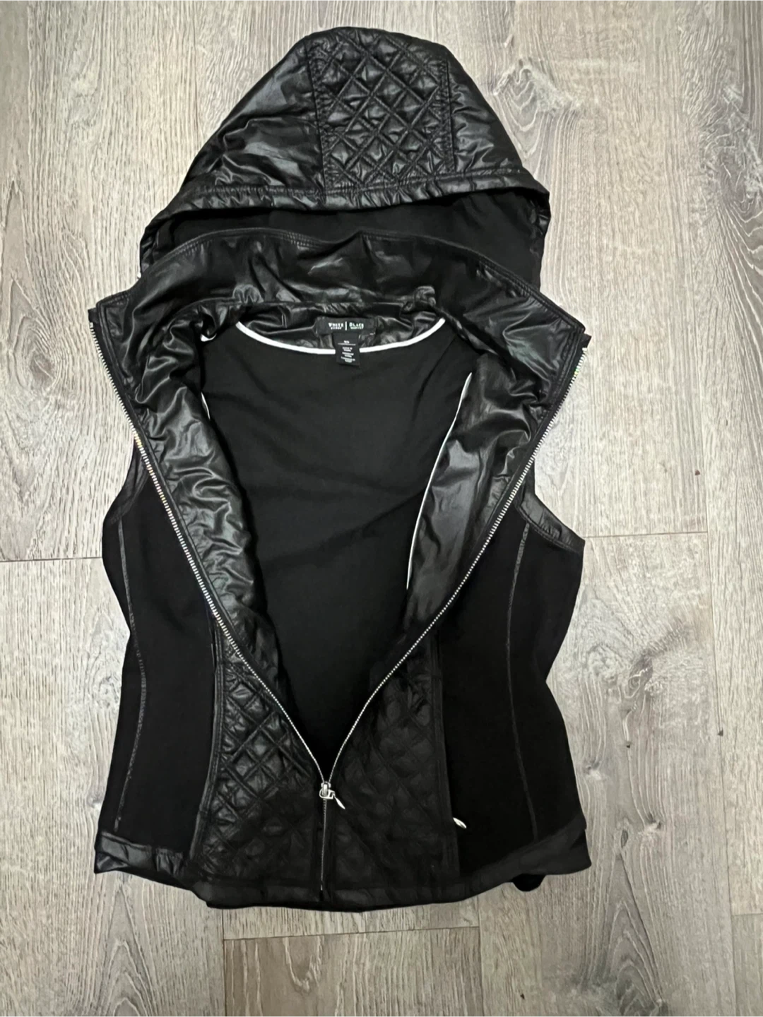 Selling a White House Black Market lightweight quilted hooded vest in size XS. It's black and has a stylish quilted design! Zipper closure with side pockets.