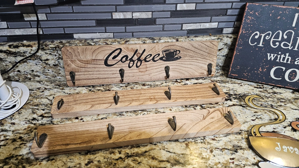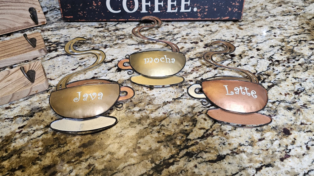 In good condition! Complete coffee station wall decor. Includes 3 metal coffee cups with latte, mocha, and java written on them, wood plaque, and coffee mug hangers 3 piece set. Asking $40 for everything!! Complete your coffee station with these cute pictures!