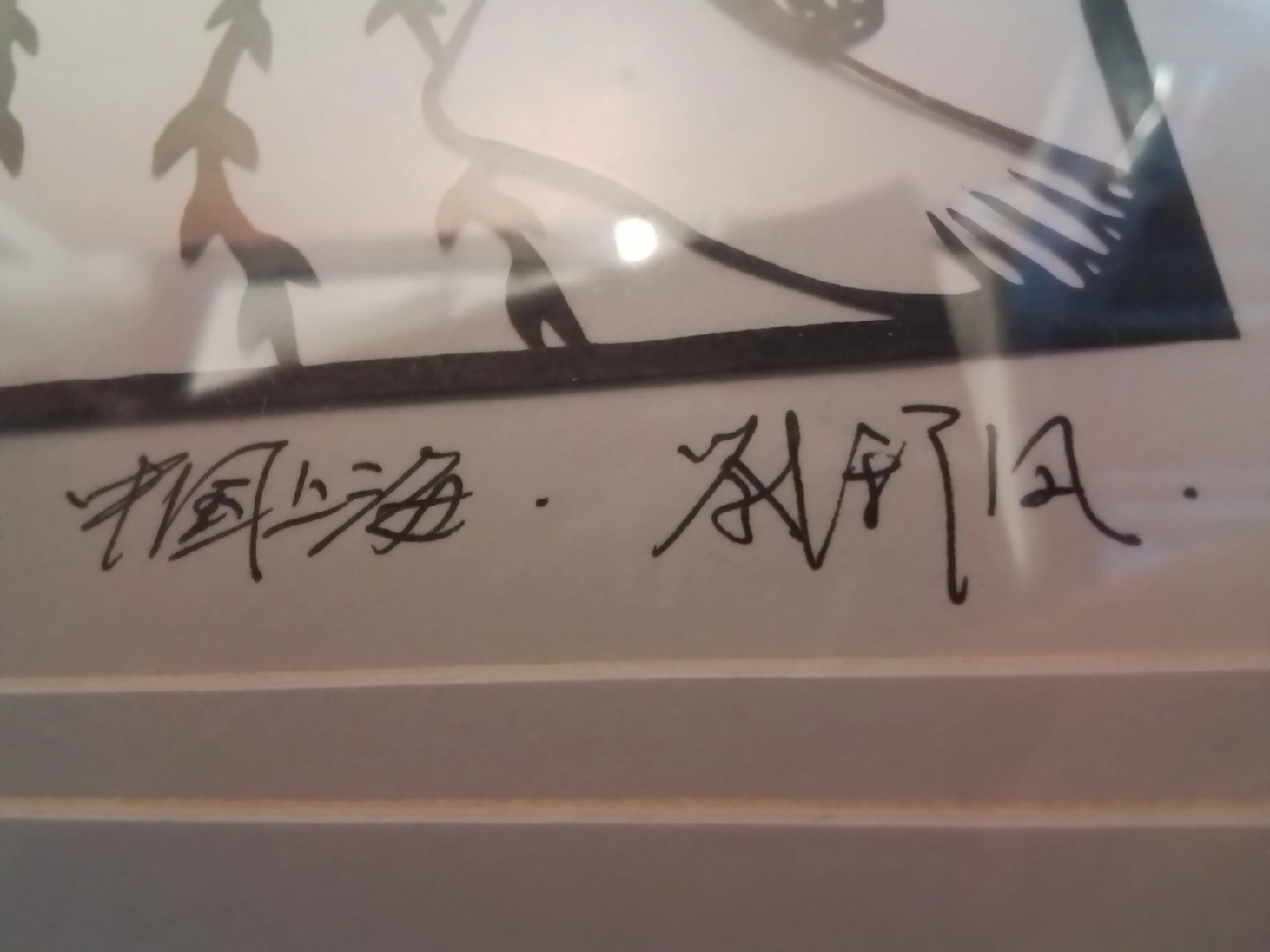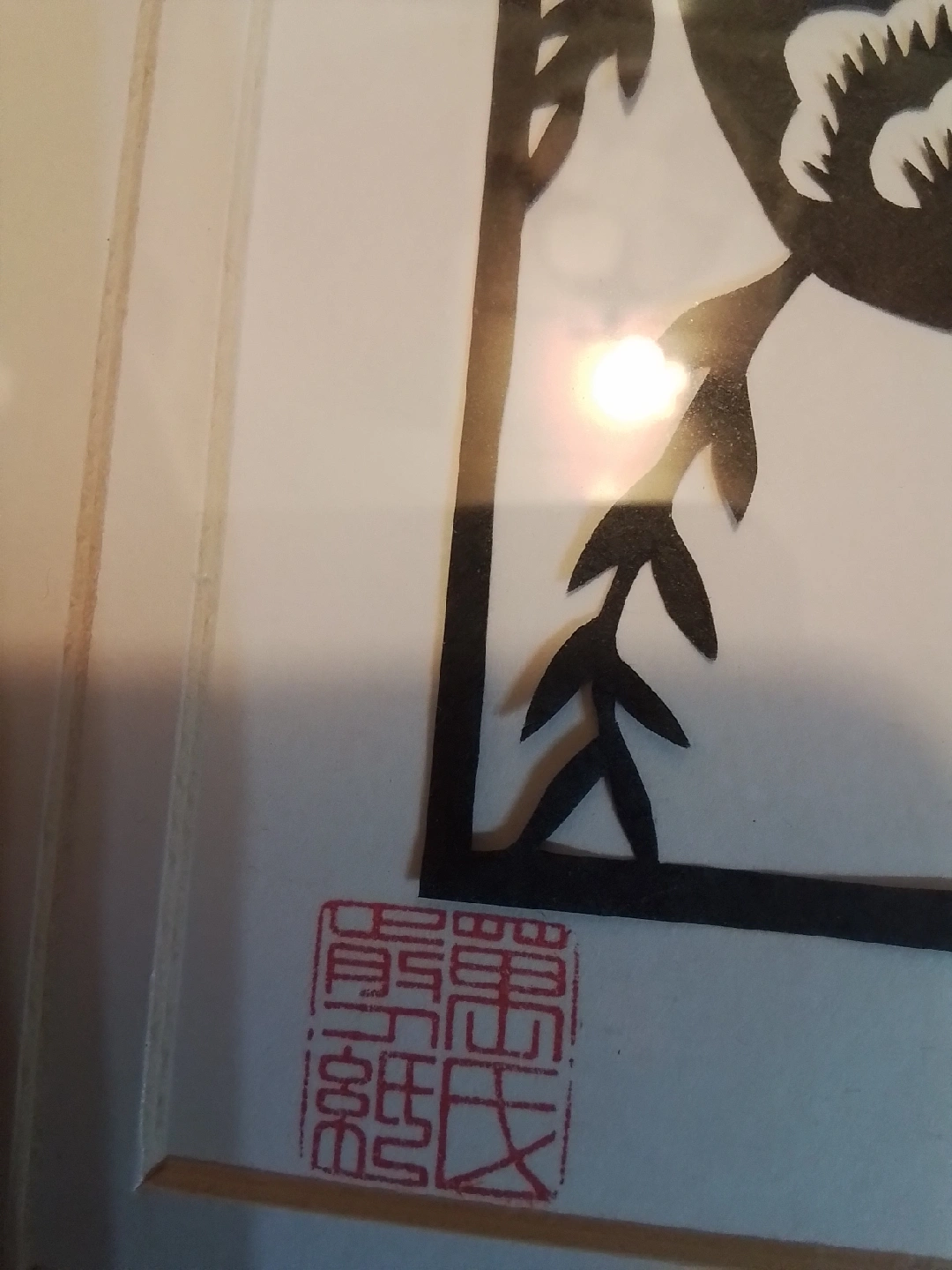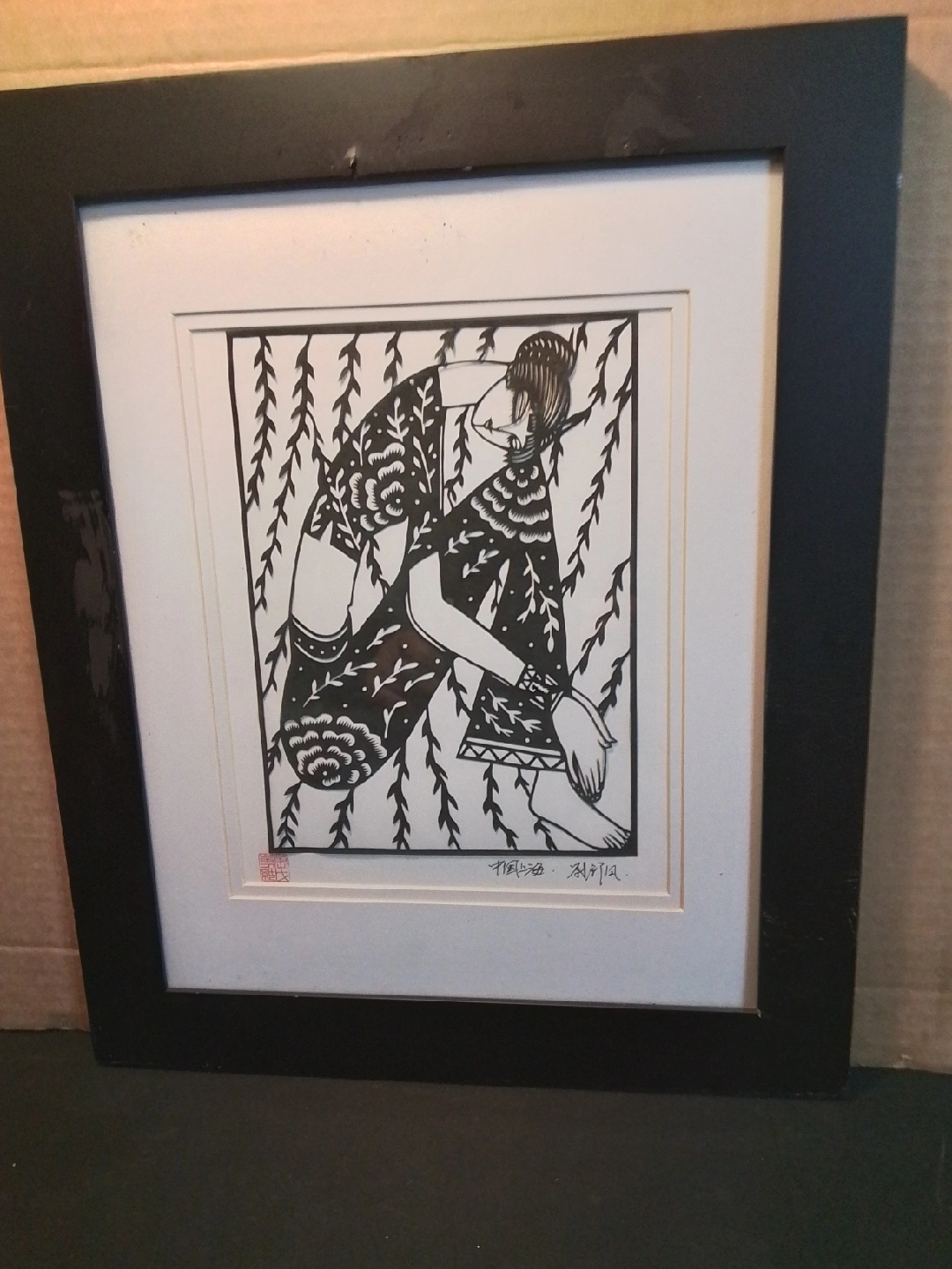 This striking piece of Asian artwork features an intricate design and is signed with a red seal, adding to its authenticity and value. The artwork is framed and measures 13.75 x 16.75 inches, making it a great addition to any art collection. This artwork is in good condition, with some wear on the frame.