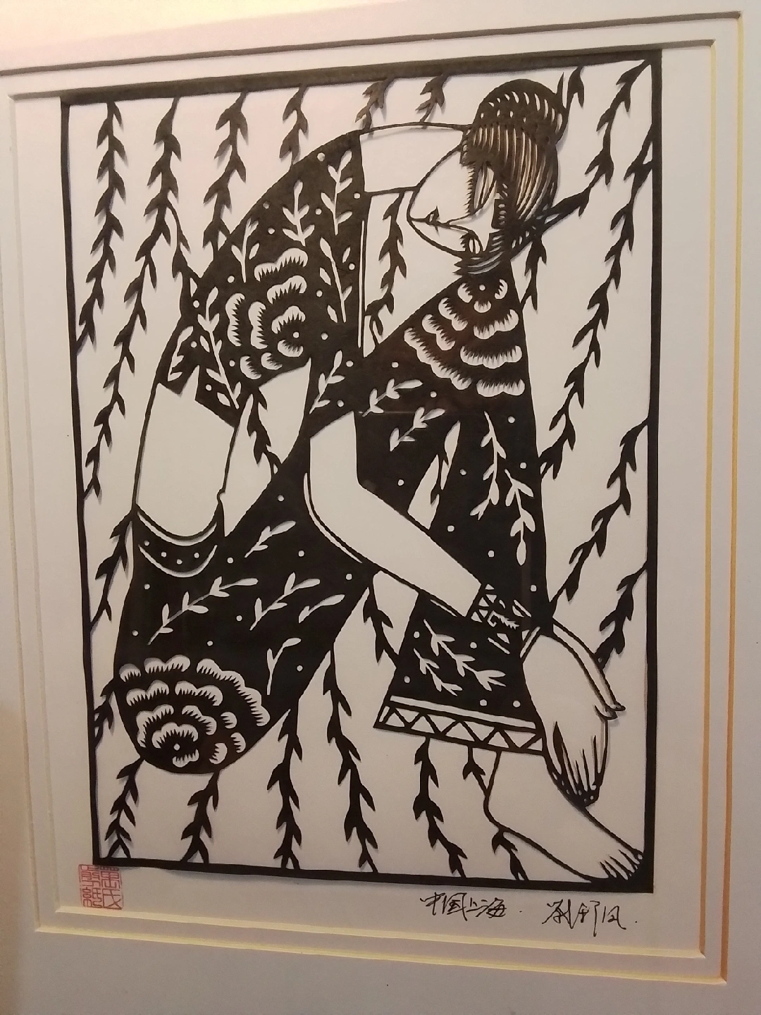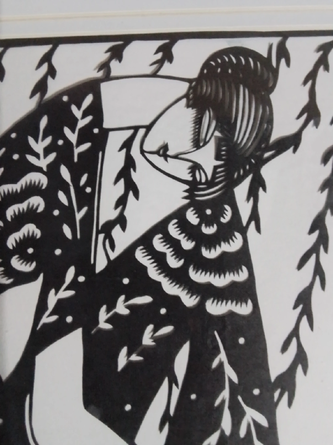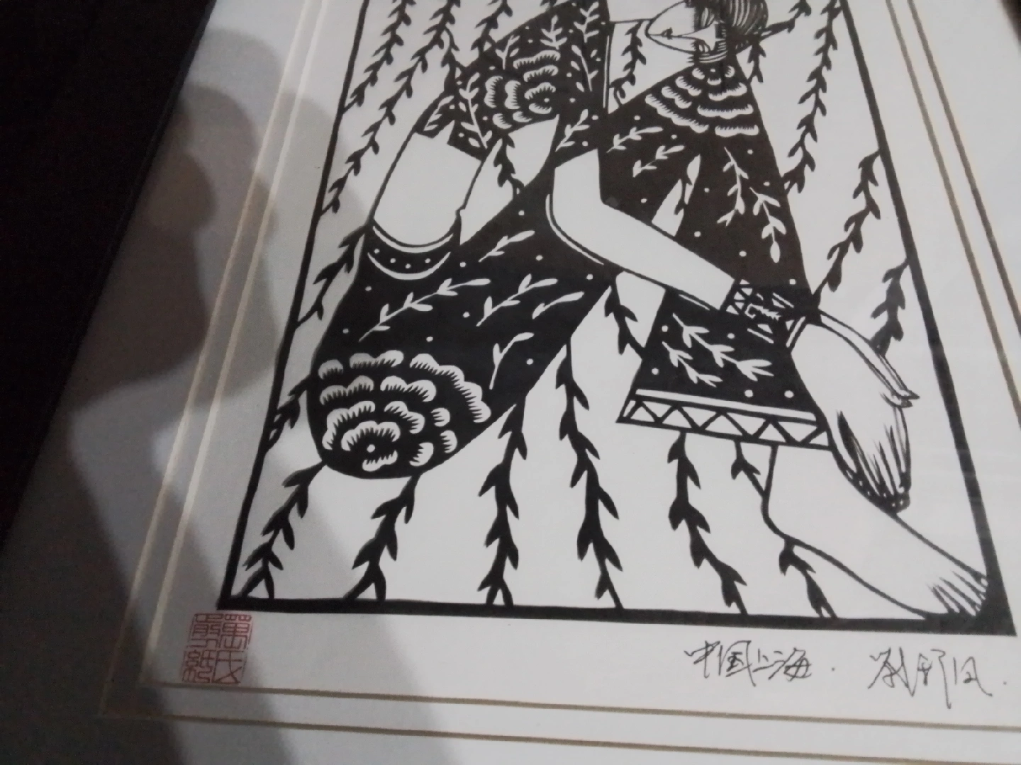 This striking piece of Asian artwork features an intricate design and is signed with a red seal, adding to its authenticity and value. The artwork is framed and measures 13.75 x 16.75 inches, making it a great addition to any art collection. This artwork is in good condition, with some wear on the frame.