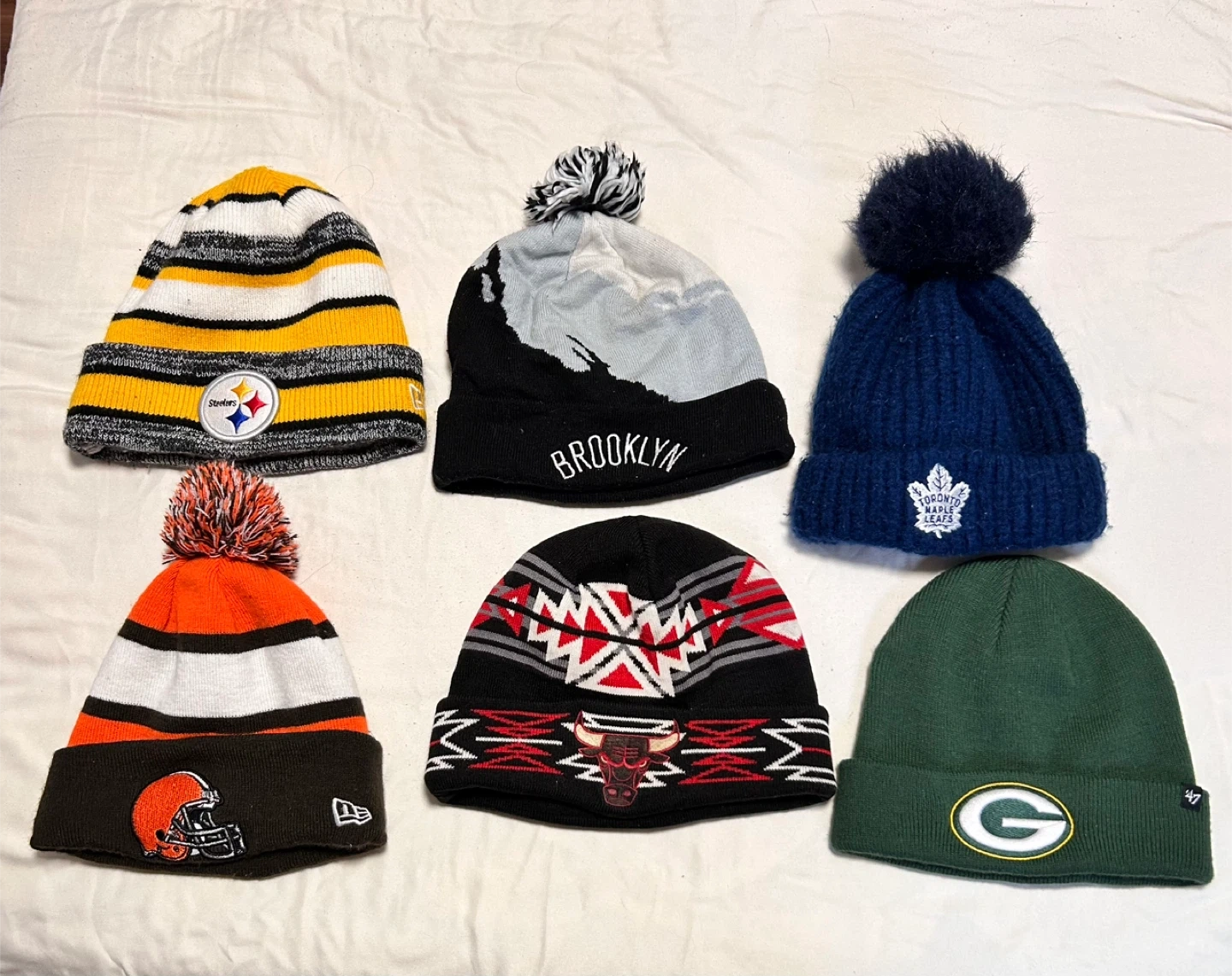 Selling a collection of assorted toques. There are a variety of sports teams represented, including the Pittsburgh Steelers, Toronto Maple Leafs, Chicago Bulls, Cleveland Browns, and Green Bay Packers. Also includes toques from New Balance, Abercrombie, and Brooklyn