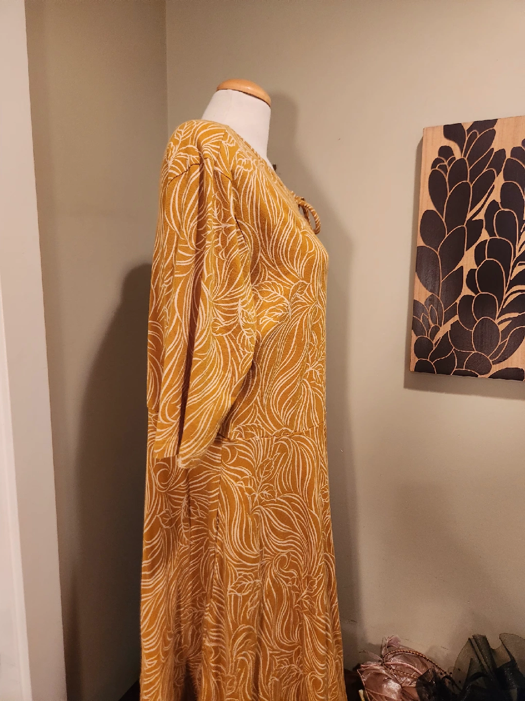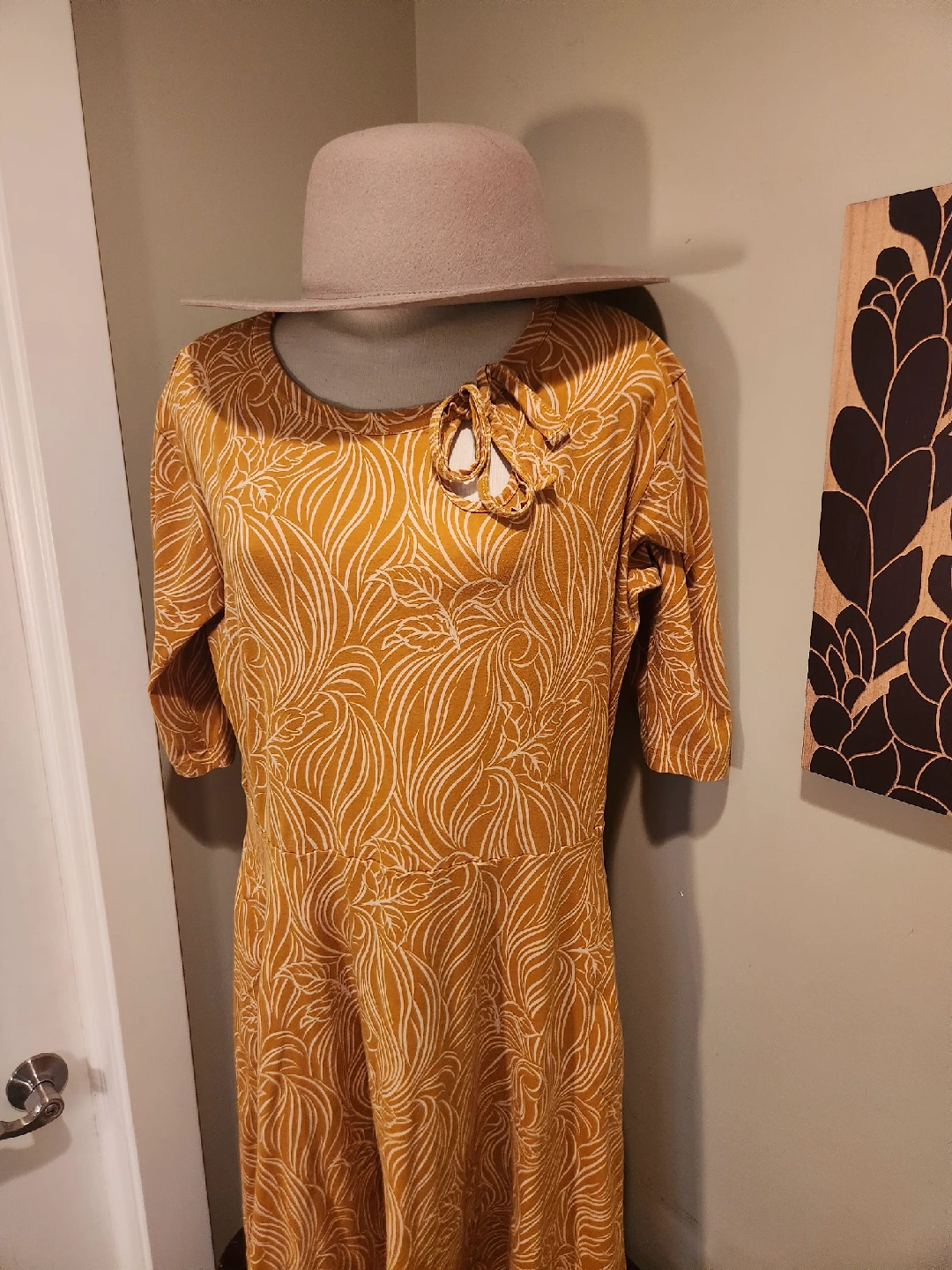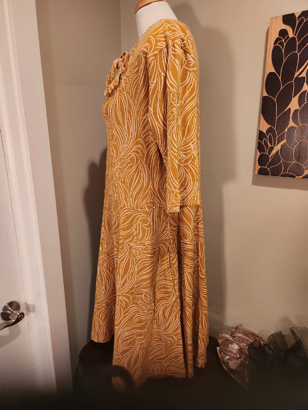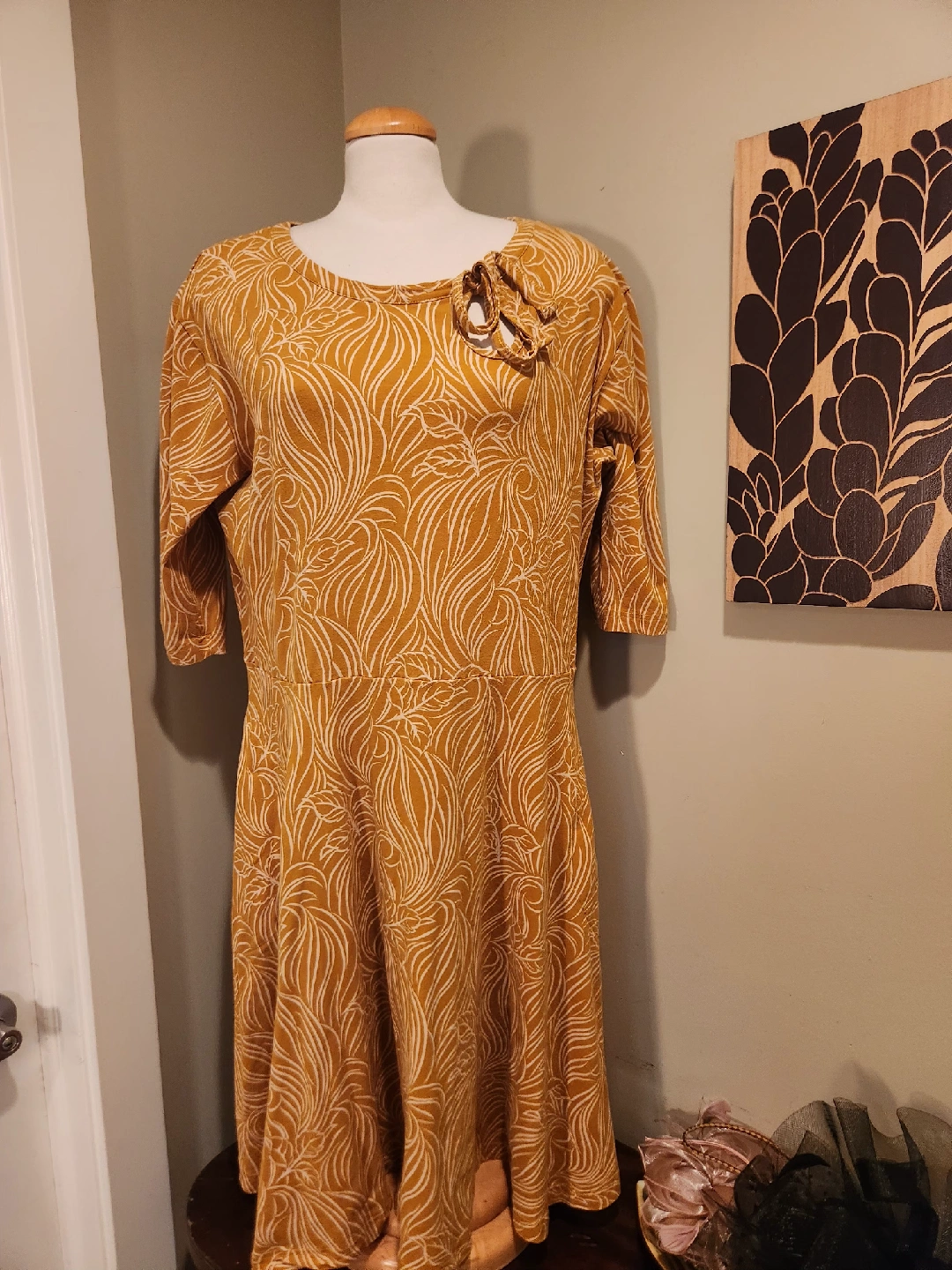 NEW, never worn EFFIE'S HEART creates gorgeous stetch cotton dresses.This size 2x is roomy enough to hug a 3x frame! This is a lovely mustard yellow dress with an abstract white leaf print. It has 3/4 sleeves and a tie detail at the neckline. Perfect for a casual or semi-formal occasions, and all year round fashion with tights and boots in fall and winter! This cotton dress is great for travel and very flattering! EFFIE'S HEART brand is not sold locally. I bought this treasure in my favorite boutique in the French Quarter New Orleans!