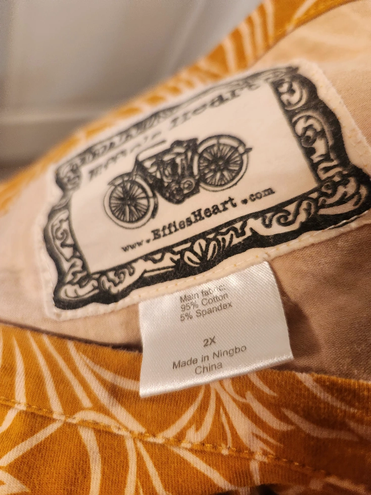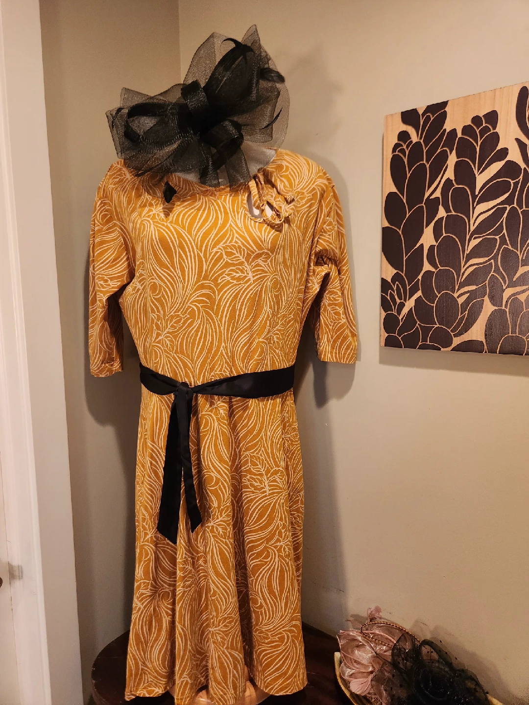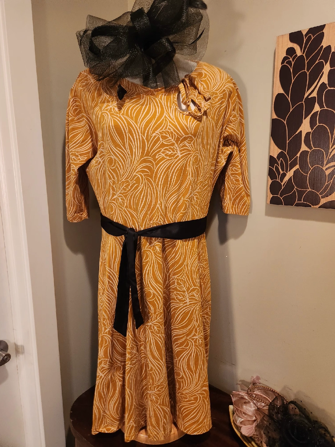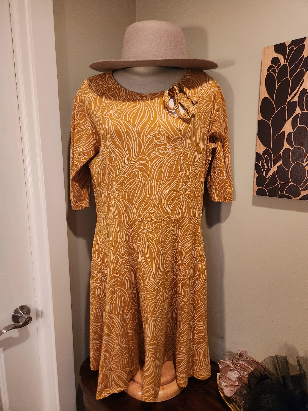 NEW, never worn EFFIE'S HEART creates gorgeous stetch cotton dresses.This size 2x is roomy enough to hug a 3x frame! This is a lovely mustard yellow dress with an abstract white leaf print. It has 3/4 sleeves and a tie detail at the neckline. Perfect for a casual or semi-formal occasions, and all year round fashion with tights and boots in fall and winter! This cotton dress is great for travel and very flattering! EFFIE'S HEART brand is not sold locally. I bought this treasure in my favorite boutique in the French Quarter New Orleans!