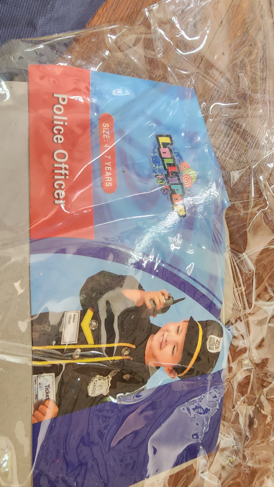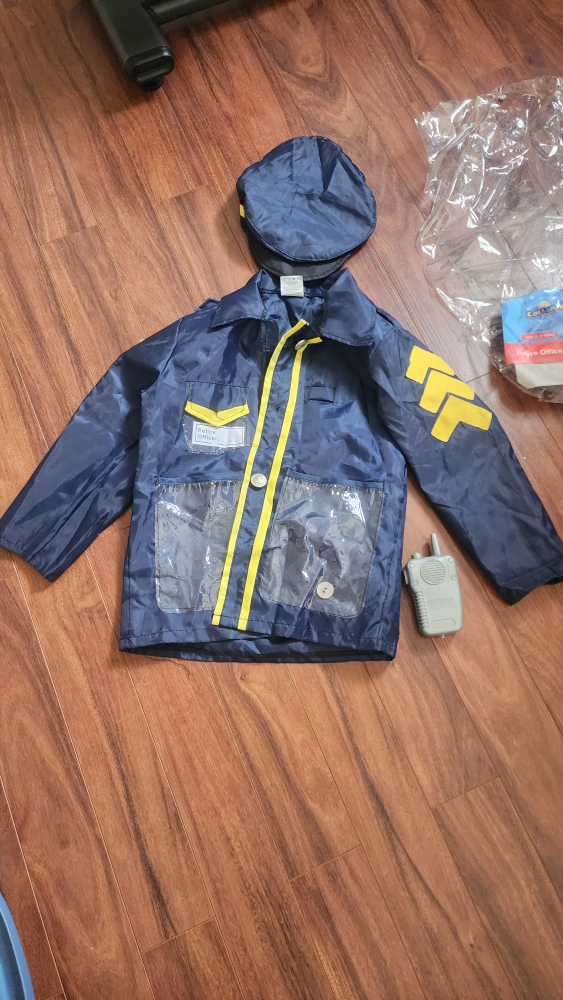 Selling a Lollipop Kids Police Officer costume, perfect for dress-up or Halloween! The size is for kids aged 4-7 years. Includes the jacket, hat, and a toy walkie-talkie to complete the look