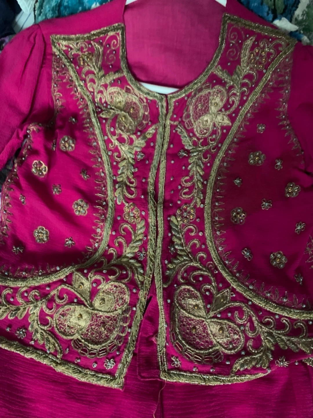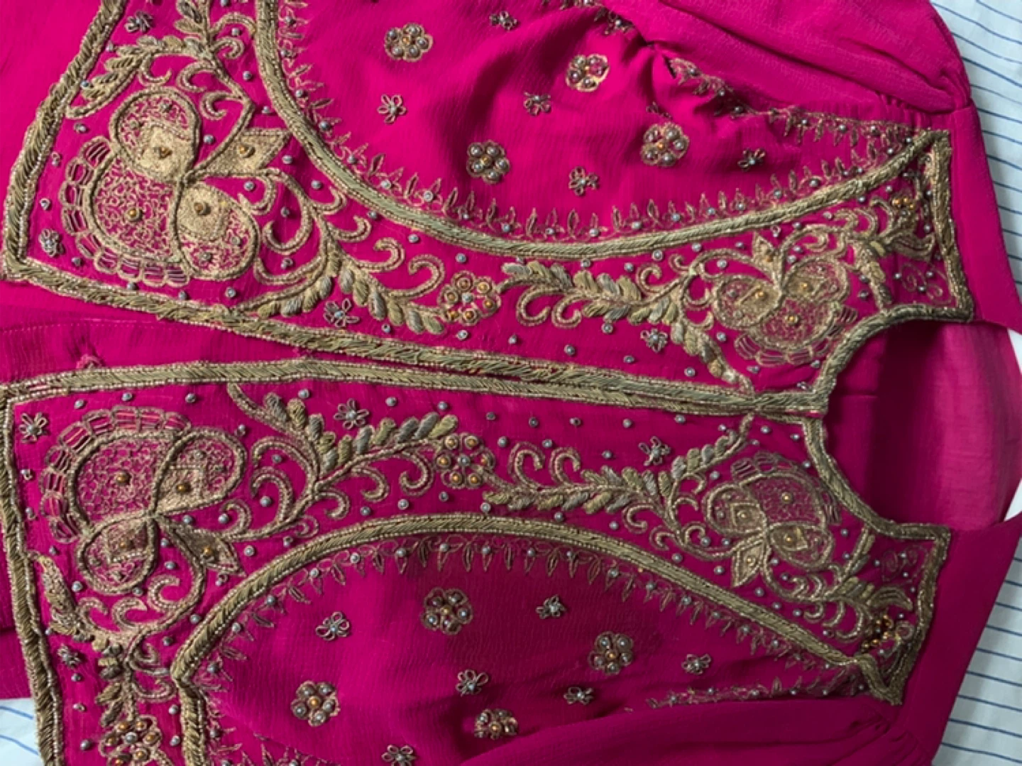 Beautiful pink Ready pleated sari with intricate gold embroidery. Perfect for a special occasion or adding a pop of colour to your wardrobe.