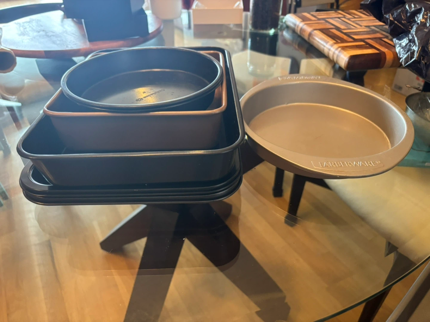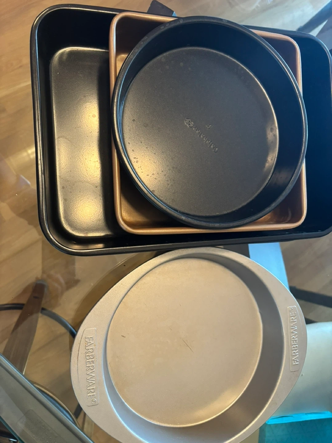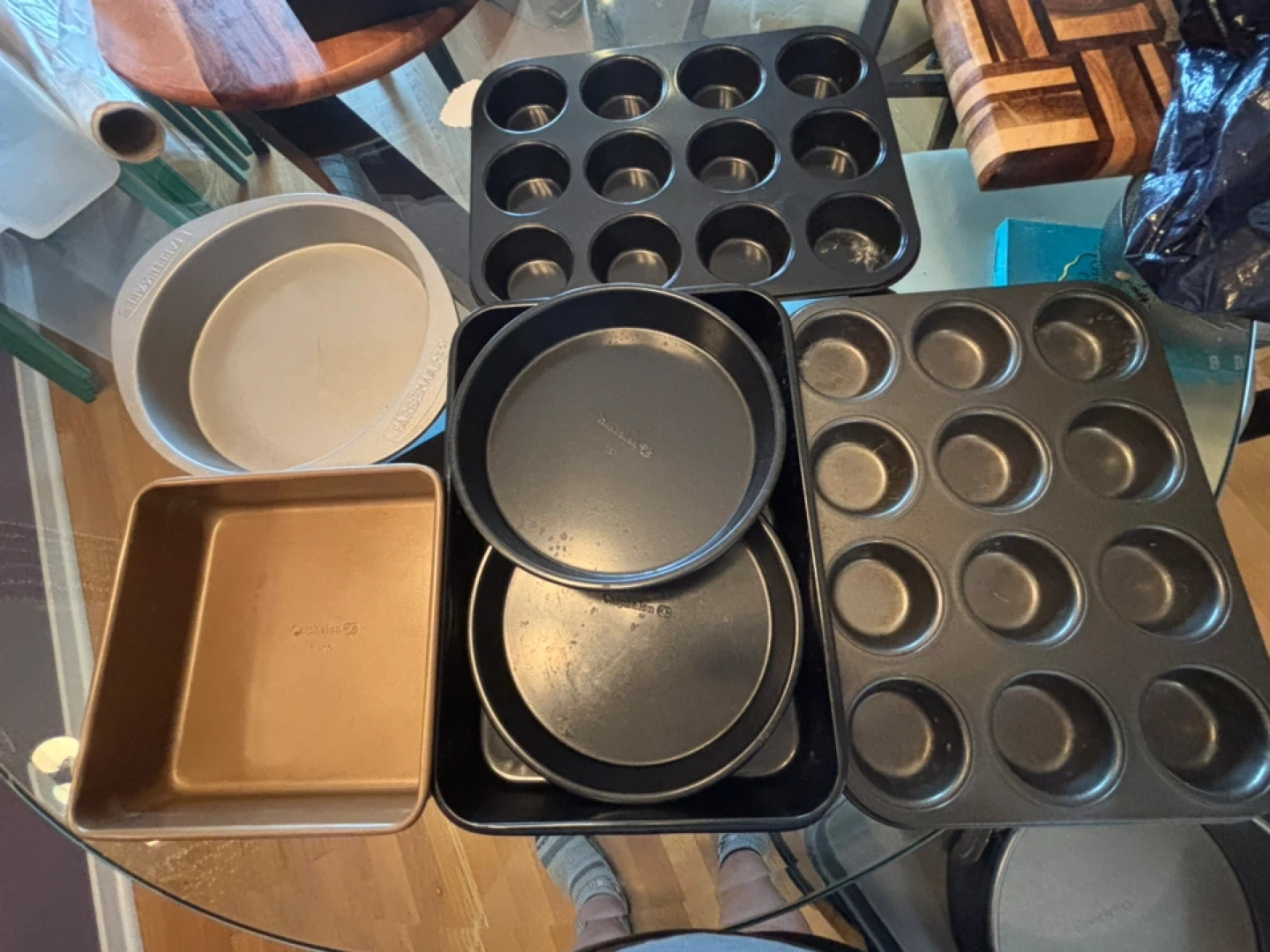 Selling a collection of assorted baking pans, including round cake pans, muffin tins, and a square pan. They're in good used condition and ready for your next baking project!