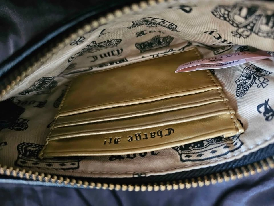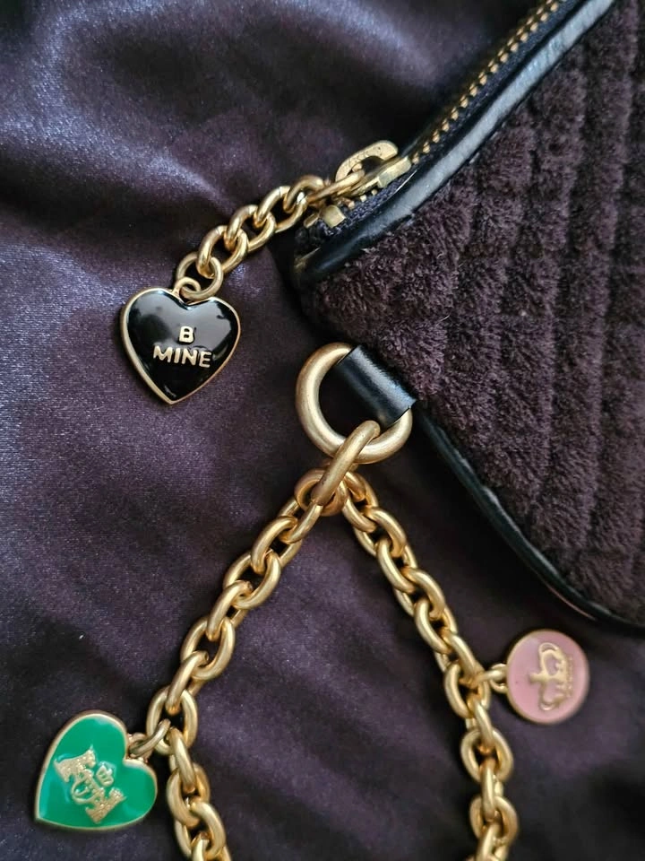 Wrist chain has large charms with various Juicy Couture logos, shaped like hearts, circles, and a wrapped candy. Charms have black/ hunter green/ light pink/ navy blue enamel. Front of bag has a large embroidered Juicy logo in off-white script, and back has a leather heart patch with an embroidered 'J'. Bag has a zippered main compartment with 4 inner card slots, and a tan cotton lining with a print of black crowns and 'Love Juicy' text.