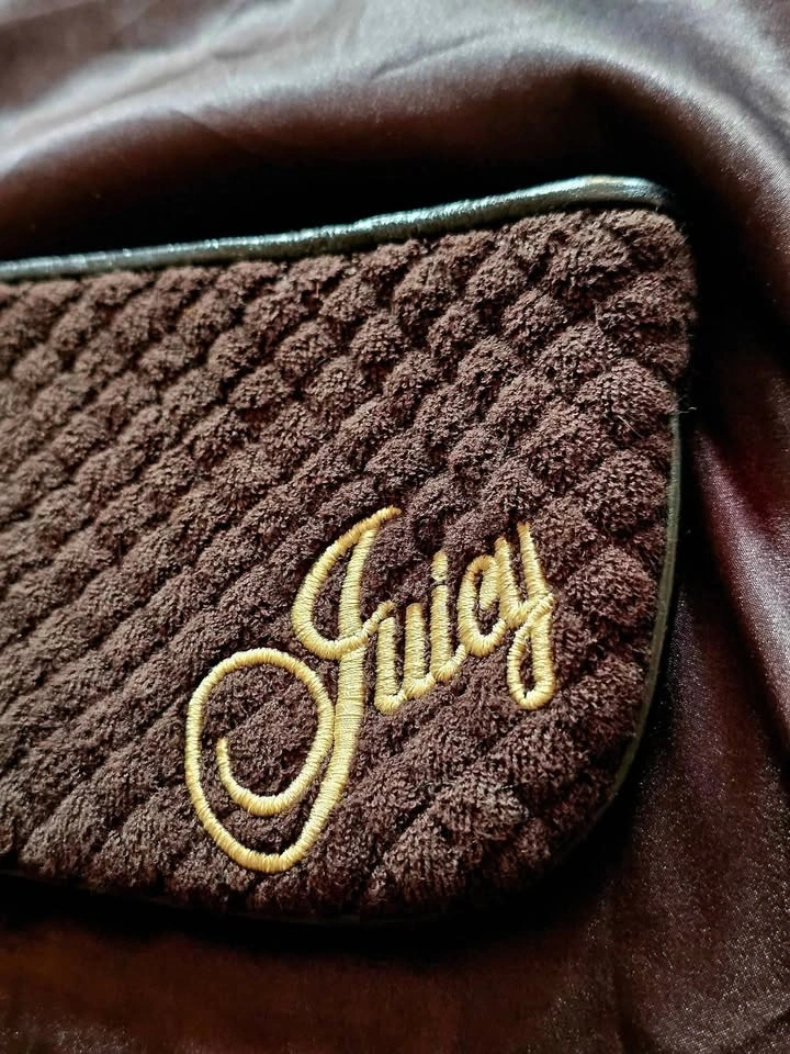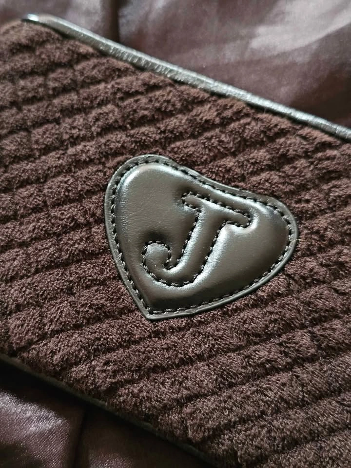 Rare vintage Y2K find! Juicy Couture wristlet bag in quilted dark brown terry cloth fabric, with genuine leather trim and a statement chunky gold tone charm bracelet style chain wrist strap.