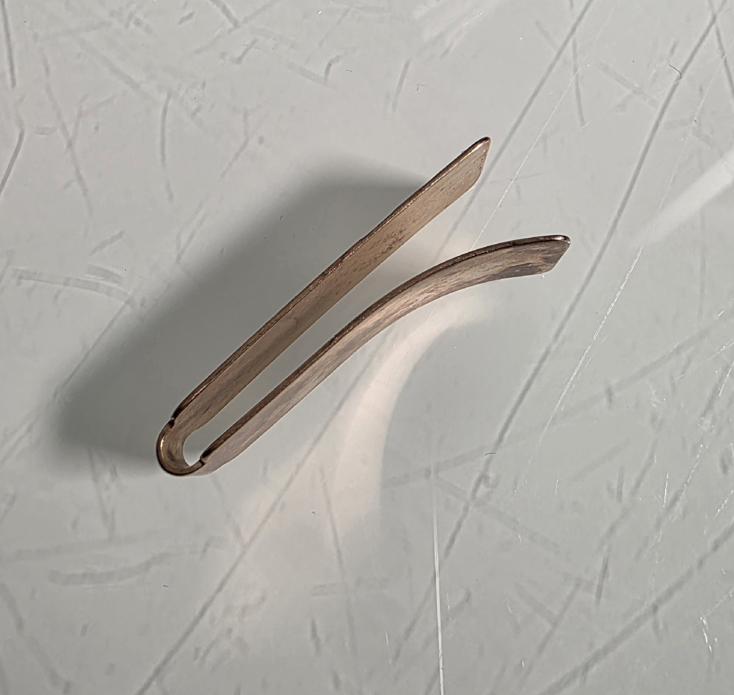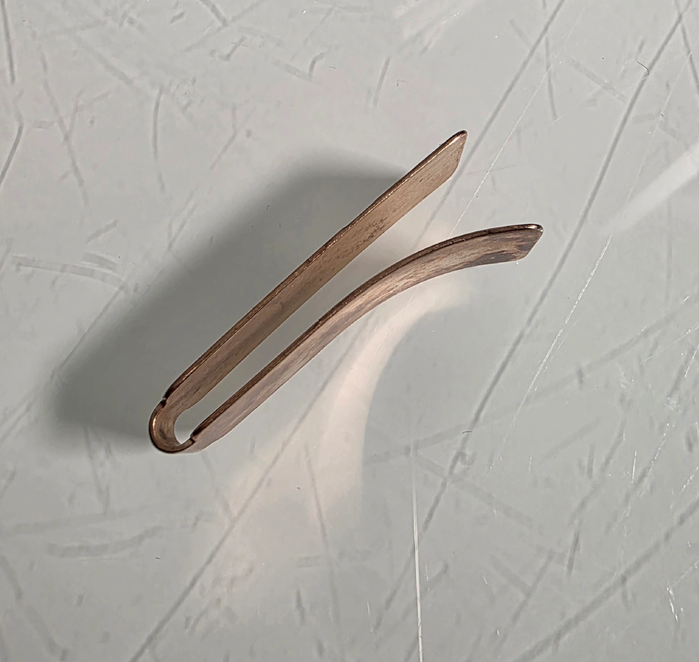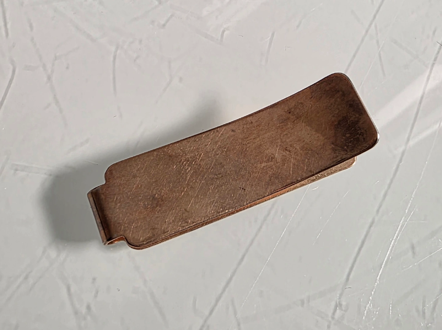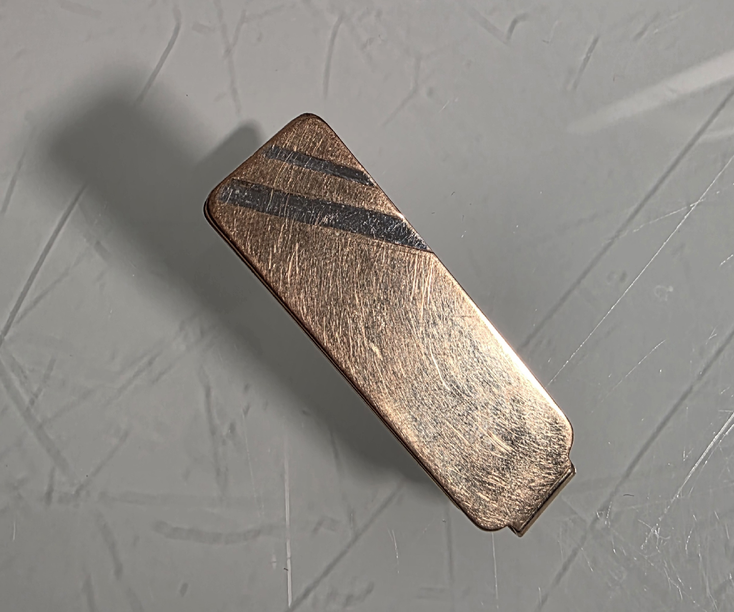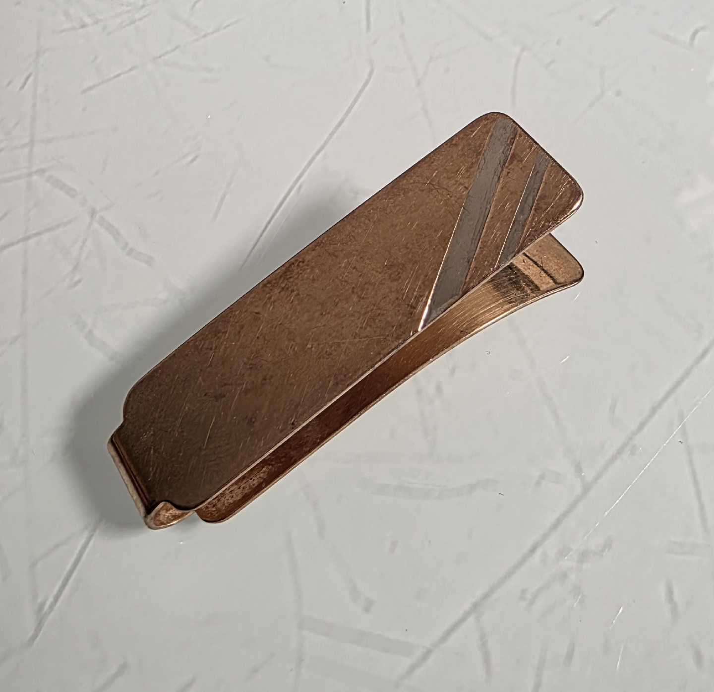 A classy authentic vintage copper money clip. It has a nice, aged look with some silver diagonal strips on the front. A classic way to keep your bills organized.