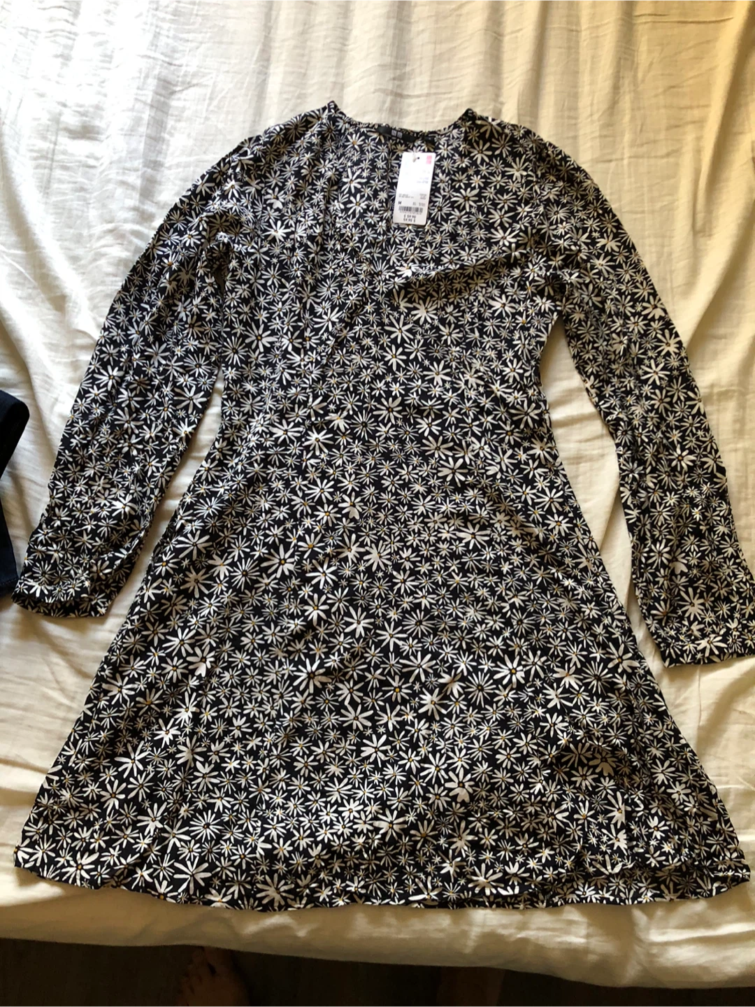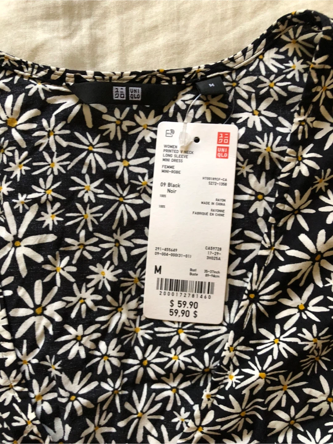 Selling a cute Uniqlo mini dress in a black and white floral print. It's a size M and made of rayon. Originally bought for $59.90!