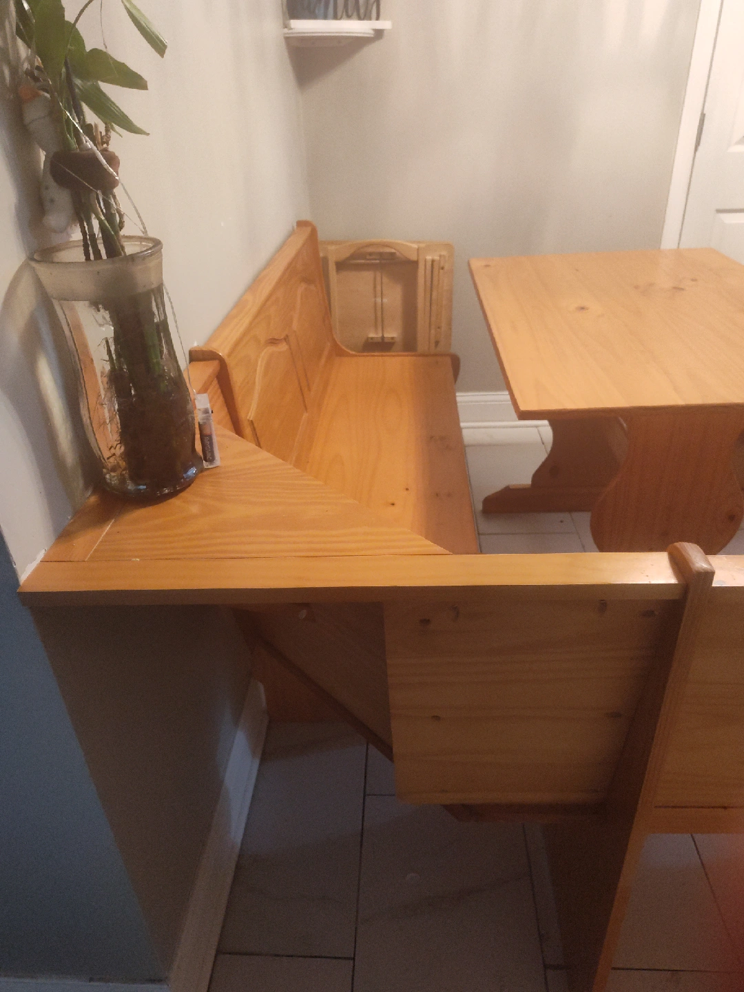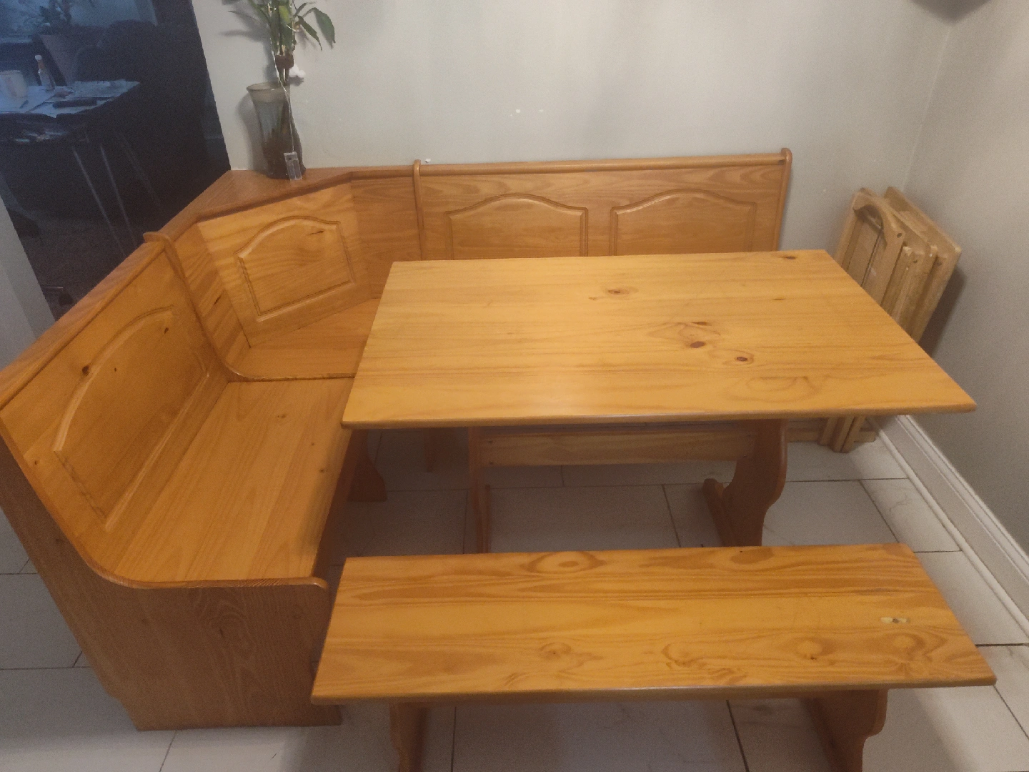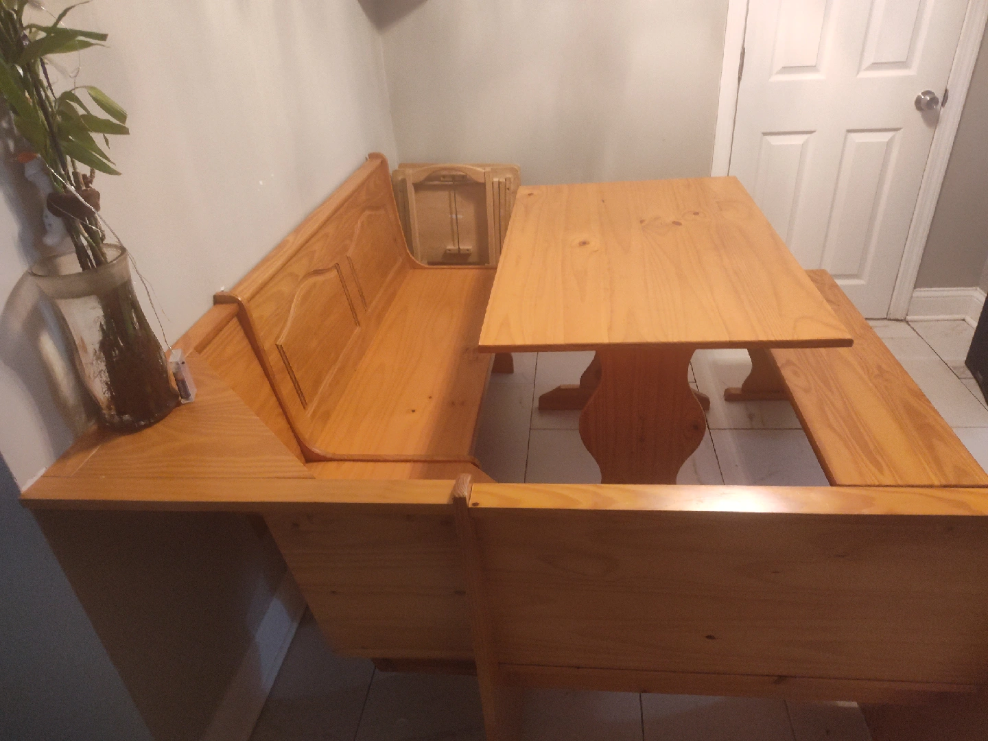 Selling a wooden dining table booth L and bench set. This set features a cozy booth seating arrangement combined with a sturdy wooden table, perfect for family meals or gatherings. It includes storage space under the seats for added convenience. The set is in good condition and ready to enhance your dining area!