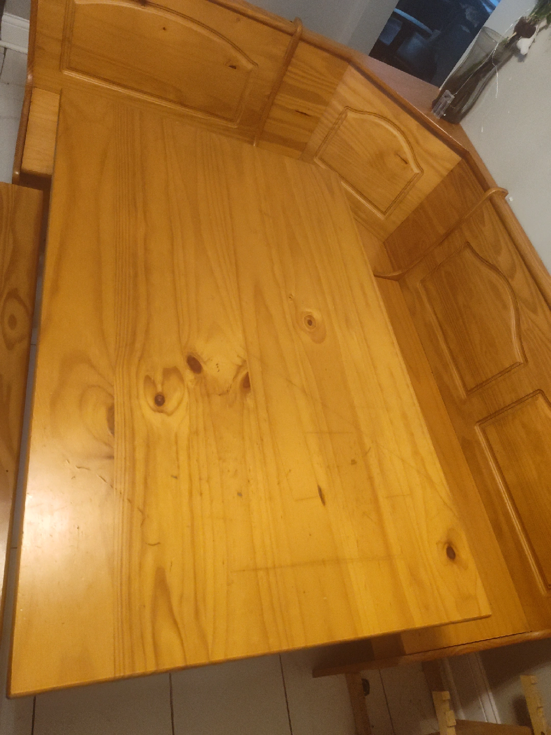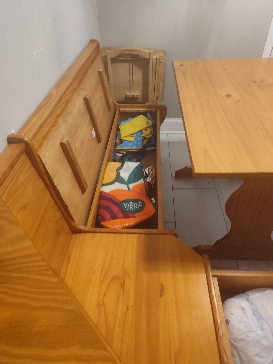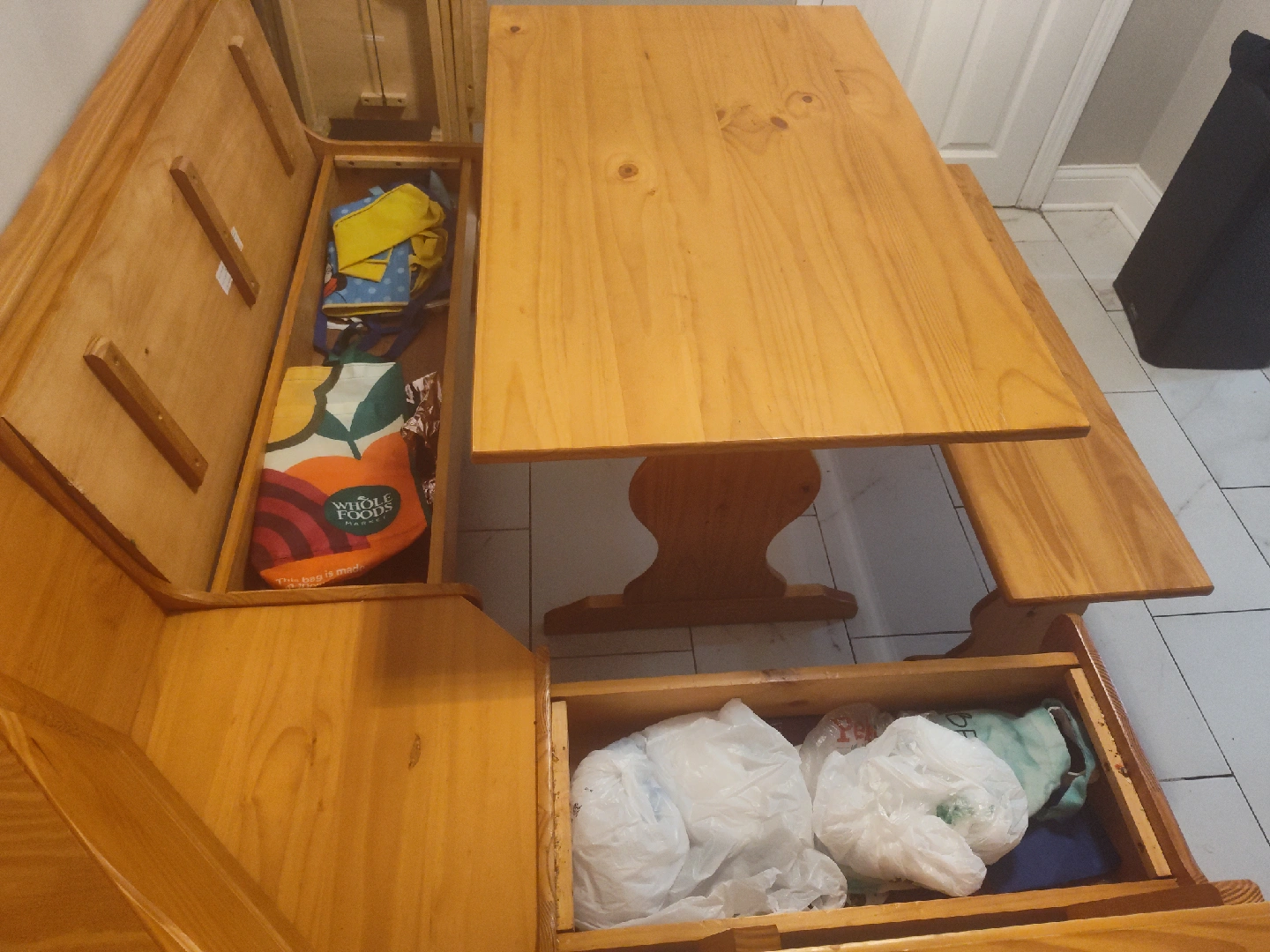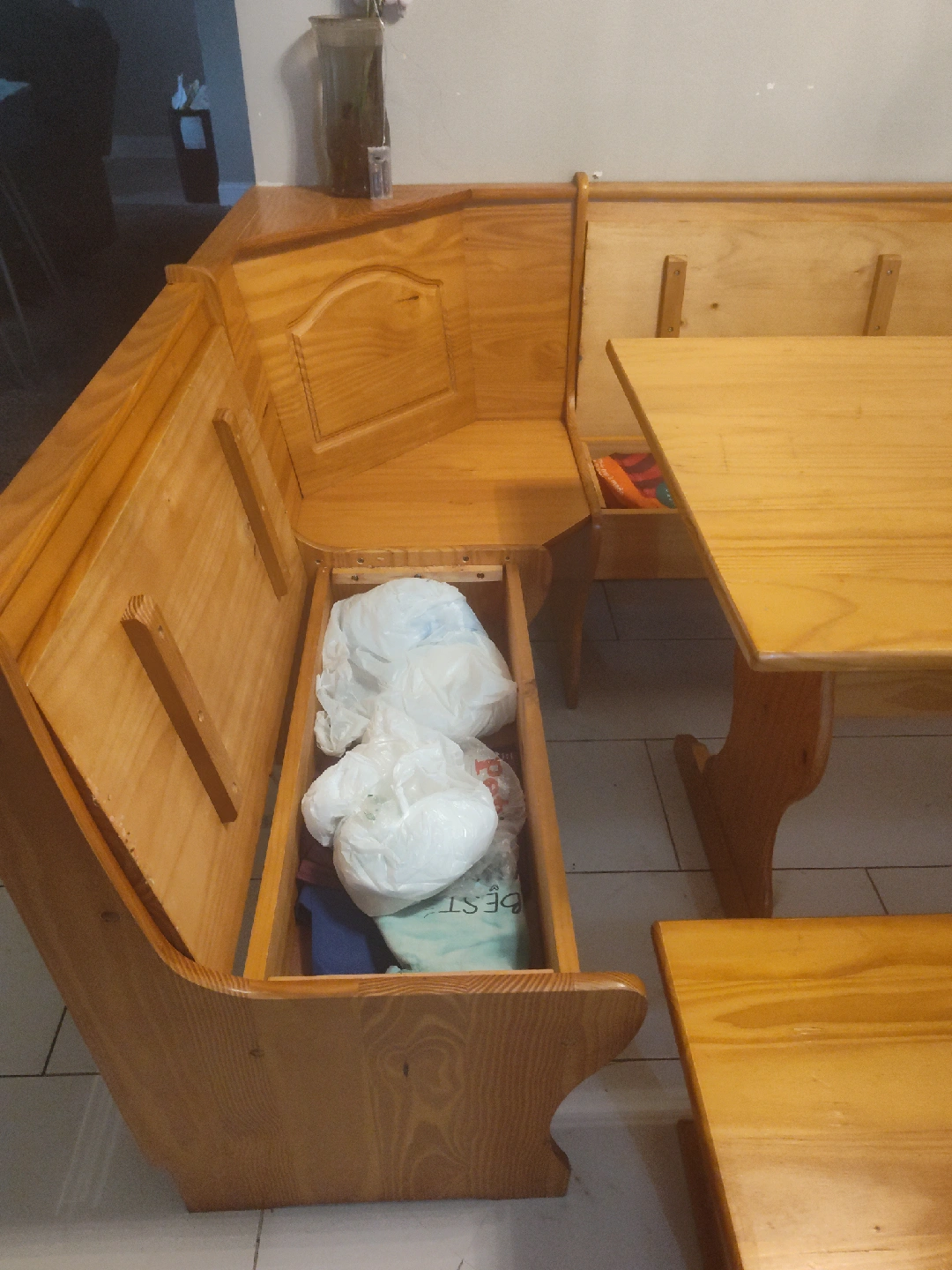 Selling a wooden dining table booth L and bench set. This set features a cozy booth seating arrangement combined with a sturdy wooden table, perfect for family meals or gatherings. It includes storage space under the seats for added convenience. The set is in good condition and ready to enhance your dining area!