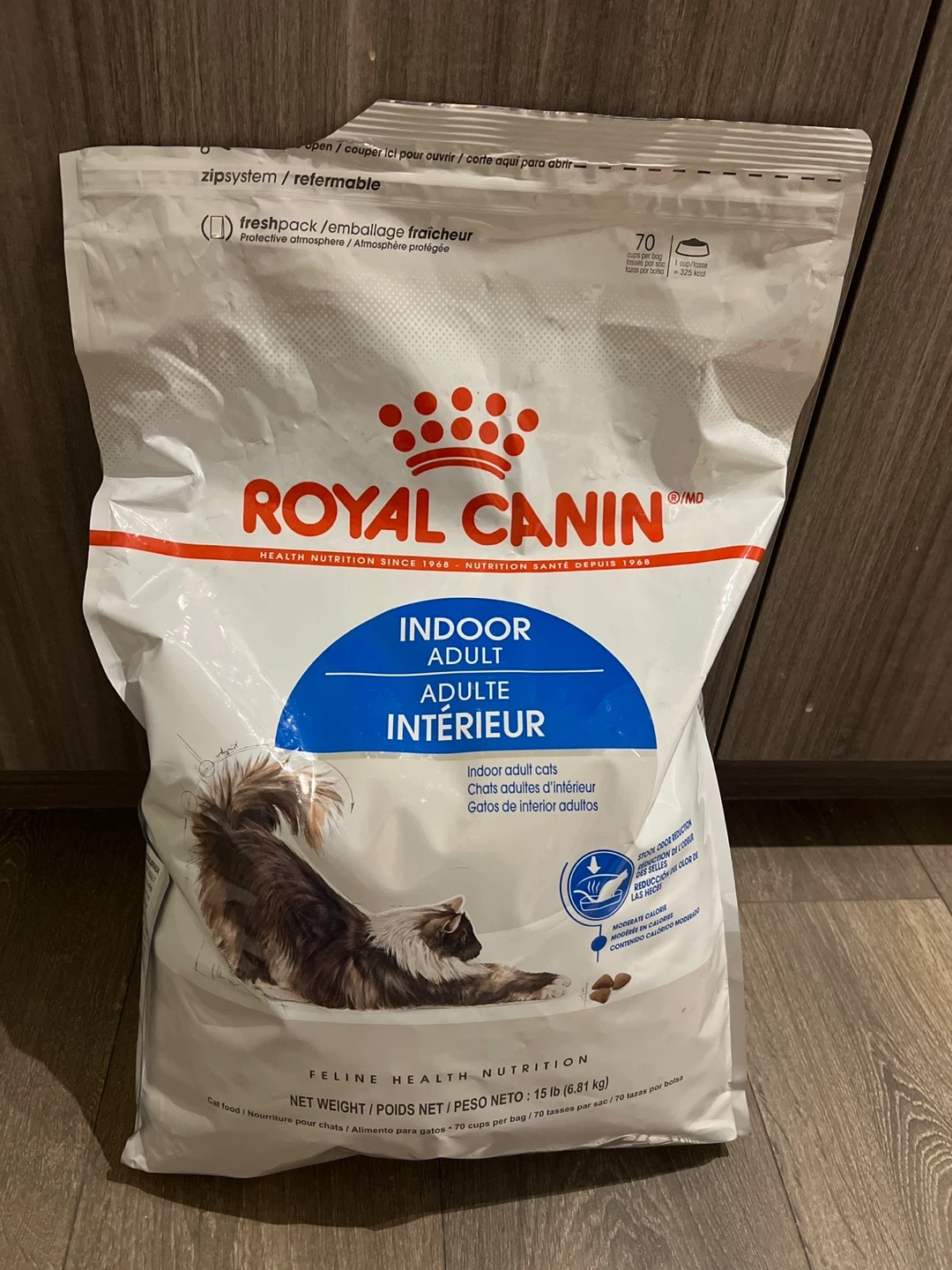 Selling a 15 lb bag of Royal Canin Indoor Adult cat food. It's formulated for indoor cats and helps with stool odour reduction. The bag contains 70 cups per bag.
