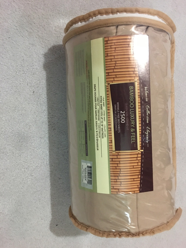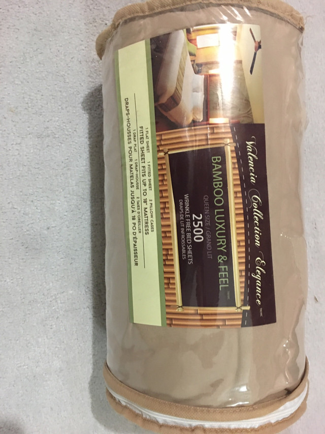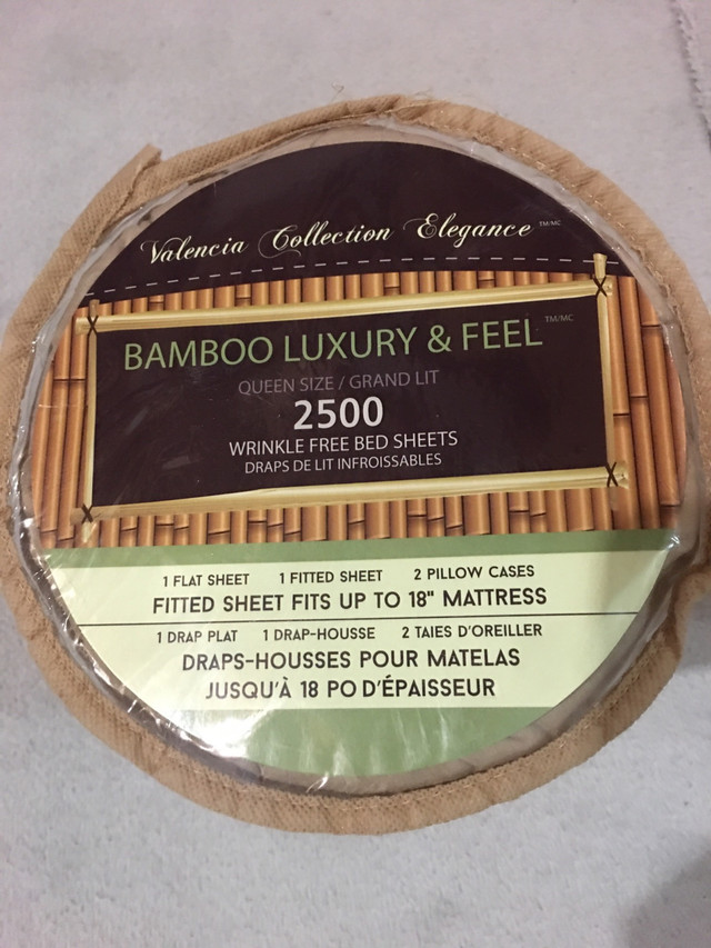 Experience luxury with this new, Valencia Collection Elegance queen-size sheet set, featuring Bamboo Luxury & Feel 2500 wrinkle-free fabric! This set includes one flat sheet, one fitted sheet (fits up to 18" mattress), and two pillowcases. Features: * Queen Size * Bamboo Luxury & Feel 2500 * Wrinkle-Free Fabric * 1 Flat Sheet * 1 Fitted Sheet (up to 18" mattress) * 2 Pillow Cases