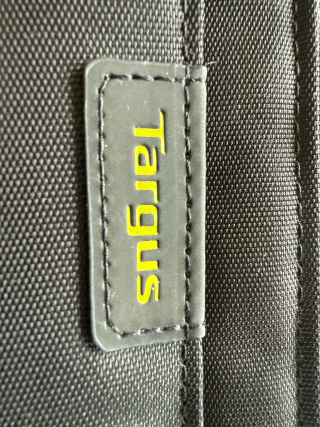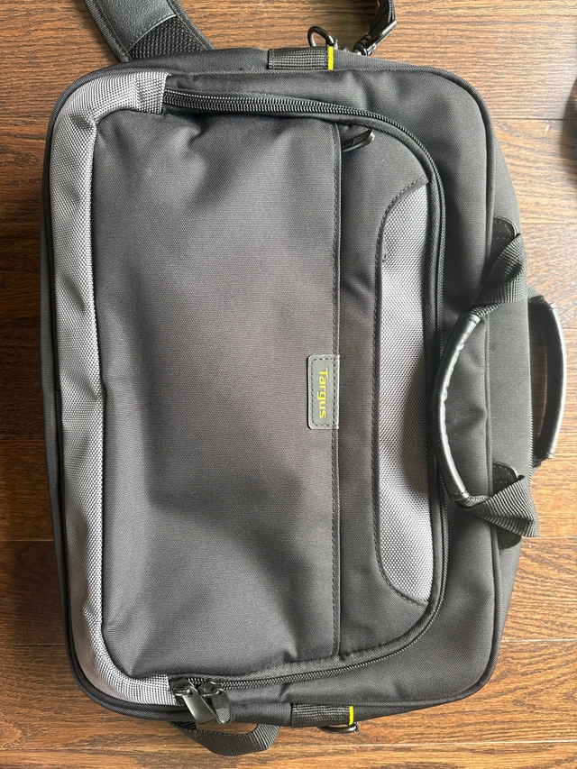 This is a used Targus laptop bag designed to carry laptops and accessories with ease. It features a padded compartment to protect your laptop, multiple pockets for organizing your accessories, and a comfortable carrying handle and shoulder strap. It is in used but good condition.