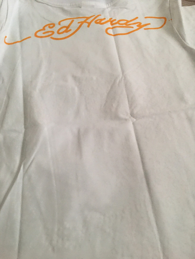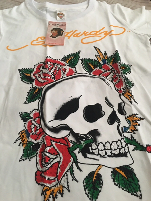 This is a new Ed Hardy T-shirt, featuring a skull and roses graphic. It's a stylish piece with the original tag still attached. Specifications: * Brand: Ed Hardy * Size: Medium * Colour: White * Graphic: Skull and roses If this ad is still up, the item is available!