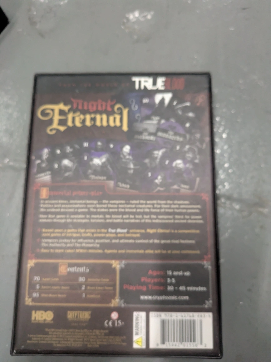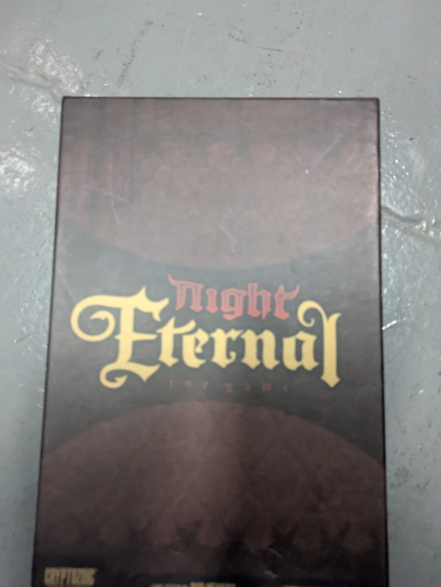 Selling a Night Eternal board game. The box includes the contents as listed: 70 agent cards, 30 immortal cards, and 95 blood moon tokens. The game is for ages 15 and up, and for 2-5 players. Playing time is 30-45 minutes